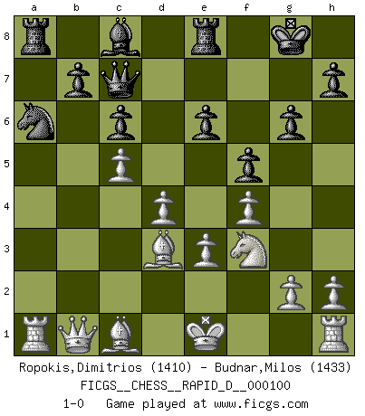 Last move : 1-0 2016 August 29 7:38:49 [Event "FICGS__CHESS__RAPID_D__000100"] [Site "FICGS"] [Date "2016.07.16"] [Round "1"] [White "Ropokis,Dimitrios"] [Black "Budnar,Milos"] [Result "1-0"] [WhiteElo "1410"] [BlackElo "1433"] 1.d4 Nf6 2.c4 e6 3.Nc3 Bb4 4.Qc2 O-O 5.f3 d5 6.a3 Ba5 7.b4 Bxb4 8.axb4 c6 9.e3 Na6 10.b5 Nb4 11.Qb1 a5 12.bxa6 Nxa6 13.c5 Qc7 14.Bd3 g6 15.f4 Re8 16.Nf3 Ne4 17.Nxe4 dxe4 18.Bxe4 f5 19.Bd3 1-0 Nimzo-Indian : Classical variation Kingside Castling by player Black (move 4) Player White won this chess game. Follow this game move after move (download)Chess is a part of culture and if a culture is declining then Chess too will decline. (Mikhail Botvinnik) Unter Putin wird alles Geld aus Russland wie von einem Staubsauger nach Moskau umgeleitet, das ist wie ein schwarzes Loch. (Garry Kasparov) El Peón aislado arroja penumbra sobre todo el tablero. (Aaron Nimzovich) La vie est comme un jeu d'échecs : nous esquissons un plan, mais celui-ci est tributaire de ce que daignent faire l'adversaire aux échecs et le destin dans la vie. (Arthur Schopenhauer) Life doesn't imitate art, it imitates bad television. (Woody Allen)