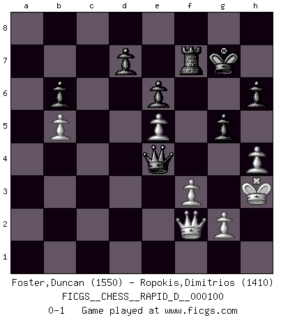Last move : 0-1 2016 August 27 13:48:39 [Event "FICGS__CHESS__RAPID_D__000100"] [Site "FICGS"] [Date "2016.07.16"] [Round "1"] [White "Foster,Duncan"] [Black "Ropokis,Dimitrios"] [Result "0-1"] [WhiteElo "1550"] [BlackElo "1410"] 1.e4 c5 2.a3 Nf6 3.e5 Nd5 4.d4 cxd4 5.Qxd4 e6 6.c4 Nc6 7.Qe4 f5 8.Qe2 Qa5+ 9.Bd2 Ndb4 10.Bc3 Nd4 11.axb4 Qxa1 12.Qd1 Nc6 13.b5 Nb4 14.Bd3 a6 15.Ne2 axb5 16.cxb5 Qa4 17.Qd2 Bc5 18.O-O Nxd3 19.Qxd3 b6 20.Nd2 Bb7 21.Bd4 Be4 22.Nxe4 fxe4 23.Qxe4 O-O 24.Qd3 Qb4 25.h3 Bxd4 26.Nxd4 Qxb2 27.Nf3 Ra7 28.Ng5 g6 29.Qd6 Ra1 30.Rxa1 Qxa1+ 31.Kh2 Rf5 32.Nf3 Qa7 33.h4 h6 34.Kh3 Qb7 35.Kg3 Kg7 36.Qd4 Qc7 37.Kh3 Rf7 38.Nd2 Qc1 39.Ne4 Qf4 40.f3 g5 41.Qf2 Qxe4 0-1 Sicilian defense Kingside Castling by player White (move 18) Kingside Castling by player Black (move 23) Player Black won this chess game. Follow this game move after move (download)We must make sure that Chess will not be like a dead language, very interesting, but for a very small group. (Sytze Faber) Modernes Schach erfordert enorme Anspannung. Es ist für einen normalen Menschen unmöglich das auszuhalten. (Viktor Kortschnoi) Con el tiempo, empecé a progresar en partidas decisivas. Tal vez porque me di cuenta de una simple verdad: no solo estaba yo nervioso sino también mi oponente. (Mikhail Tal) Des points faibles ou des trous dans la position de l'adversaire doivent être occupés par des pièces et non pas par des pions. (Siegbert Tarrasch) Winning isn't everything... but losing is nothing. (Mednis)
