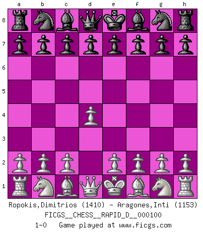 Last move : 1-0 2016 August 16 19:57:25 [Event "FICGS__CHESS__RAPID_D__000100"] [Site "FICGS"] [Date "2016.07.16"] [Round "1"] [White "Ropokis,Dimitrios"] [Black "Aragones,Inti"] [Result "1-0"] [WhiteElo "1410"] [BlackElo "1153"] 1.d4 1-0 This chess game has been lost on time (started : 2016.07.16 7:30:25) Queen's pawn Player White won this chess game. Follow this game move after move (download)A thorough understanding of the typical mating continuations makes the most complicated sacrificial combinations leading up to them not only not difficult, but almost a matter of course. (Siegbert Tarrasch) Ein Großmeister muß tausende Partien in seinem Kopf speichern, denn diese sind für Ihn, was die Worte der Muttersprache für gewöhnliche Leute sind, oder Noten für Musiker... (Garry Kasparov) Si el Ajedrez es una ciencia, es la mas inexacta. Si el Ajedrez es un arte, es demasiado inexacto para ser visto como tal. Si el Ajedrez es un deporte, es demasiado esotérico. Si el Ajedrez es un juego, es demasiado exigente para ser solo un juego. Si el Ajedrez es una aventura, es una muy demandante. Si el Ajedrez es una pasión, es una muy gratificante. Si el Ajedrez es la vida, es una muy triste. (Anónimo) Les Echecs représentent une sphère d'idées créatrices basée sur la volonté des deux protagonistes. (Smyslov) Never was anything great achieved without danger. (Niccolo Machiavelli)