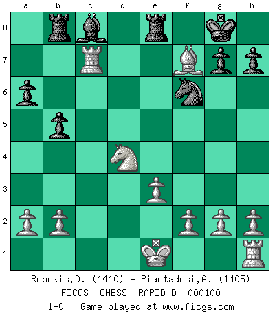 Last move : 1-0 2016 August 13 23:38:15 [Event "FICGS__CHESS__RAPID_D__000100"] [Site "FICGS"] [Date "2016.07.16"] [Round "1"] [White "Ropokis,Dimitrios"] [Black "Piantadosi,Angelo"] [Result "1-0"] [WhiteElo "1410"] [BlackElo "1405"] 1.d4 d5 2.c4 e6 3.Nc3 Nf6 4.Bg5 Nbd7 5.Nf3 Be7 6.e3 O-O 7.Qc2 c5 8.cxd5 Nxd5 9.Bxe7 Qxe7 10.Nxd5 exd5 11.dxc5 Qxc5 12.Rc1 Qxc2 13.Rxc2 Re8 14.Bb5 a6 15.Ba4 b5 16.Bb3 Bb7 17.Rc7 Bc8 18.Bxd5 Rb8 19.Nd4 Nf6 20.Bxf7+ 1-0 QGD : 4.Bg5 Nbd7 Kingside Castling by player Black (move 6) Player White won this chess game. Follow this game move after move (download)All I want to do, ever, is just play Chess. (Bobby Fischer) Fischer ist das größte Genie, das je vom Schachhimmel heruntergestiegen ist. (Mikhail Nekhemyevich Tal) Alguna parte de un error es siempre correcto. (Savielly Tartakover) Je crois qu'il existe des manières très spécifiques de jouer efficacement contre une machine. Evidemment, nous n'avons aucune chance en technique pure, parce que l'ordinateur calcule de manière parfaite. Mais lorsque nous faisons appel à notre cerveau, en utilisant l'intuition et la compréhension, alors nous restons beaucoup plus forts. (Anatoli Karpov) All the biggest technological inventions created by man - the airplane, the automobile, the computer - says little about his intelligence, but speaks volumes about his laziness. (Mark Kennedy)