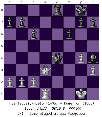 Last move : 0-1 2016 August 13 23:39:44 [Event "FICGS__CHESS__RAPID_D__000100"] [Site "FICGS"] [Date "2016.07.16"] [Round "1"] [White "Piantadosi,Angelo"] [Black "Kuge,Tom"] [Result "0-1"] [WhiteElo "1405"] [BlackElo "1666"] 1.e4 c6 2.d4 d6 3.Nf3 Qc7 4.Nc3 Bg4 5.Be2 Nd7 6.O-O Ngf6 7.Be3 e5 8.dxe5 dxe5 9.Qd2 Be7 10.Rad1 Rd8 11.Qc1 O-O 12.h3 Bh5 13.g4 Bg6 14.Nh4 Bxe4 15.Nxe4 Nxe4 16.Bd3 Bxh4 17.Bxe4 f6 18.f4 exf4 19.Bxf4 Ne5 20.Bxe5 Qxe5 21.Qe3 Rxd1 22.Rxd1 Re8 23.Qd3 Qxe4 0-1 Caro-Kann defense Kingside Castling by player White (move 6) Kingside Castling by player Black (move 11) Player Black won this chess game. Follow this game move after move (download)A Chess game is a dialogue, a conversation between a player and his opponent. Each move by the opponent may contain threats or be a blunder, but a player cannot defend against threats or take advantage of blunders if he does not first ask himself: What is my opponent planning after each move ? (Bruce A. Moon) Ich bin der einzige Schachspieler, der sich während der Vorbereitungen zum Turnier verletzt hat. (Woody Allen) Nada excita más a Grandes Maestros aburridos que una novedad teórica. (Dominic Lawson) Comme les marins qui ont mille raisons différentes d'aller en mer, les joueurs d'échecs en ont tout autant avant de s'installer devant une table et jouer... (Vincent Bertignac, philosophe) Art disturbs, science reassures. (Georges Braque, Le Jour et la Nuit)