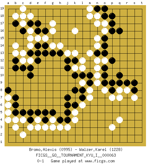 Last move : 0-1 2016 September 19 18:18:48 [Event "FICGS__GO__TOURNAMENT_KYU_I__000063"] [Site "FICGS"] [Date "2016.07.16"] [Round "1"] [Black "Bromo,Alexis"] [White "Walzer,Karel"] [Result "0-1"] [Rating 1 "0995"] [Rating 2 "1228"] 1.q16 d16 2.d4 q4 3.q10 k4 4.d10 k16 5.k10 f3 6.f4 g4 7.g5 e4 8.f5 d3 9.e5 e3 10.h4 g3 11.c3 c4 12.d5 b4 13.c5 c2 14.j5 k5 15.k6 o17 16.p17 o16 17.p16 r8 18.r9 q8 19.q9 c12 20.c11 d12 21.d11 l6 22.l7 k7 23.j6 m7 24.l8 m8 25.m9 l9 26.k8 n9 27.m10 l11 28.l10 k11 29.j11 k13 30.j12 j13 31.h13 h14 32.g13 g14 33.f13 d14 34.e12 g17 35.o15 o12 36.p12 n15 37.o14 n14 38.o13 n11 39.o11 n12 40.o10 n10 41.o9 o8 42.p8 p7 43.p9 q7 44.s8 s7 45.s9 p3 46.f14 f15 47.e14 e15 48.d13 c13 49.e13 b14 50.b12 b13 51.b11 h3 52.j4 j3 53.j7 a7 54.b7 a6 55.b6 a5 56.b5 b3 57.a8 a4 58.k12 l12 59.o18 n18 60.p18 n17 61.n13 m13 62.n19 m19 63.o19 m18 64.d17 c17 65.c18 d18 66.e17 b18 67.f16 g16 68.c16 c19 69.b17 c18 70.e16 d15 0-1 Here are the names of the openings (joseki) played in the four corners : Corner d4 : d4 f3 Hoshi (Hwajeom, Seongjeom, Xingwei`) 4-4 Point. The star or hoshi (4-4) point, emphasizing influence at the potential expense of territory. Ikken Kakari (Hankan Keolch'im, Yi Gua`jiao~, 1-Space Low Approach). White 2 is the standard approach move to the 4-4. Corner q16 : q16 o17 Hoshi (Hwajeom, Seongjeom, Xingwei`) 4-4 Point. The star or hoshi (4-4) point, emphasizing influence at the potential expense of territory. Ikken Kakari (Hankan Keolch'im, Yi Gua`jiao~, 1-Space Low Approach). White 2 is the standard approach move to the 4-4. Player White won this Go (weiqi, baduk) game. Follow this game move after move (download)Use a wall to attack, not to make territory. (Anonymous) Heh, heh, heh. Time to abandon ship. (General Grievous in Star Wars ep.3)