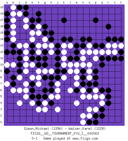 Last move : 0-1 2016 August 11 22:11:28 [Event "FICGS__GO__TOURNAMENT_KYU_I__000063"] [Site "FICGS"] [Date "2016.07.16"] [Round "1"] [Black "Simon,Mickael"] [White "Walzer,Karel"] [Result "0-1"] [Rating 1 "1396"] [Rating 2 "1228"] 1.r16 c4 2.q3 d16 3.p17 e4 4.q10 j3 5.r5 d10 6.f17 f16 7.g16 f15 8.e17 d17 9.k17 o3 10.e16 e15 11.o6 m4 12.j13 r13 13.p13 p11 14.p9 o10 15.j10 m8 16.m6 q12 17.f10 d7 18.r11 m10 19.e12 d13 20.m13 k8 21.h8 j7 22.g15 k10 23.j11 o8 24.p8 f13 25.c10 d11 26.c11 d12 27.c12 c13 28.b13 b14 29.c9 d9 30.b7 c8 31.b8 c6 32.r14 a10 33.b12 b6 34.a14 a13 35.a15 b15 36.a16 b16 37.a17 b17 38.a18 b18 39.a12 b10 40.a9 a7 41.q13 r12 42.p2 o2 43.h7 j6 44.g5 g4 45.h4 h5 46.h6 j5 47.f4 g3 48.f5 f3 49.o1 n1 50.p1 n2 51.s11 f12 52.d18 c18 53.f18 h12 54.j12 f9 55.g10 f7 56.g6 n12 57.e11 h9 58.j9 g9 59.j8 l6 60.g11 h13 61.n13 n6 62.n7 n5 63.o7 m7 64.h14 g14 65.h15 p3 66.q2 q4 67.r4 q5 68.q6 o5 69.r6 k11 70.m12 n11 71.n9 o9 72.n8 m9 73.c19 b19 74.d19 k12 75.e13 e14 76.e6 d6 77.e7 e8 78.e5 d5 79.s14 s12 80.q11 p12 81.t12 k13 82.k14 l13 83.l14 t13 84.t11 s13 85.t14 o13 86.o14 o12 87.g12 g13 88.g8 f8 89.k9 l9 90.l11 l10 91.m11 n10 92.n14 e10 93.f11 p6 94.p7 p5 0-1 Here are the names of the openings (joseki) played in the four corners : Corner d16 : d16 f17 Hoshi (Hwajeom, Seongjeom, Xingwei`) 4-4 Point. The star or hoshi (4-4) point, emphasizing influence at the potential expense of territory. Ikken Kakari (Hankan Keolch'im, Yi Gua`jiao~, 1-Space Low Approach). Black 2 is the standard approach move to the 4-4. Player White won this Go (weiqi, baduk) game. Follow this game move after move (download)Josekis are not fixed, definitive things. They indicate the moments when everything can change. (Pierre Audouard) Beta. Software undergoes beta testing shortly before it's released. Beta is latin for still doesn't work. (Anonymous)