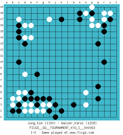 Last move : 1-0 2016 August 20 13:24:35 [Event "FICGS__GO__TOURNAMENT_KYU_I__000063 "] [Site "FICGS"] [Date "2016.07.16"] [Round "1"] [Black "Jung,Kim "] [White "Walzer,Karel "] [Result "1-0"] [Rating 1 "1150"] [Rating 2 "1228"] 1.r16 c4 2.q4 d16 3.e4 d5 4.c3 d3 5.d4 b3 6.c2 c5 7.b2 p16 8.n17 q16 9.r15 r17 10.s17 r18 11.q13 s18 12.k17 h17 13.p18 p17 14.r10 o18 15.n18 p19 16.c14 d14 17.d13 e14 18.c16 c17 19.c15 e16 20.c10 d8 21.e5 o3 22.m3 o5 23.q6 g3 24.j3 e3 25.f3 f2 26.f4 e2 27.g4 h3 28.h4 j2 29.k2 b4 30.h2 g2 31.j1 d2 32.f8 1-0 Here are the names of the openings (joseki) played in the four corners : Corner d4 : c4 e4Komoku (Somok, Xiao~mu`) 3-4 Point. The komoku (3-4) point is the traditional corner enclosure move..Ikken Takagakari (Hankan Nop'dakeolch'im, Yi Gaogua`jiao~, 1-Space High Approach). The 5-4 approach move has become more popular in modern times, as modern Go emphasizes speed and influence. Corner q16 : r16 p16Komoku (Somok, Xiao~mu`) 3-4 Point. The komoku (3-4) point is the traditional corner enclosure move..Ikken Takagakari (Hankan Nop'dakeolch'im, Yi Gaogua`jiao~, 1-Space High Approach). The 5-4 approach move has become more popular in modern times, as modern Go emphasizes speed and influence. Corner q4 : q4 o3Hoshi (Hwajeom, Seongjeom, Xingwei`) 4-4 Point. The star or hoshi (4-4) point, emphasizing influence at the potential expense of territory.Ikken Kakari (Hankan Keolch'im, Yi Gua`jiao~, 1-Space Low Approach). White 2 is the standard approach move to the 4-4. Player Black won this Go (weiqi, baduk) game.Follow this game move after move (download ) Connect with good shape. (Anonymous) If only faces could talk... (Pat Summerall, Sportscaster during the Super Bowl)