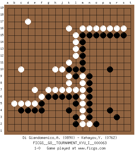 Last move : 1-0 2016 October 31 1:35:58 [Event "FICGS__GO__TOURNAMENT_KYU_I__000063"] [Site "FICGS"] [Date "2016.07.16"] [Round "1"] [Black "Di Giandomenico,Alfonso"] [White "Kehayov,Yulian"] [Result "1-0"] [Rating 1 "0890"] [Rating 2 "0762"] 1.d4 q16 2.q4 d17 3.k4 c10 4.q10 k16 5.r15 c5 6.c4 b5 7.q15 r16 8.s15 p16 9.r3 e5 10.e4 d5 11.f5 e7 12.f4 f6 13.g6 g7 14.h6 h7 15.j6 h10 16.m10 k11 17.m11 l12 18.m12 l13 19.m13 l14 20.m14 l15 21.m15 m16 22.n15 n16 23.o15 o16 24.k10 j10 25.l10 m3 26.n3 m4 27.n4 m5 28.n5 m6 29.n6 l7 30.l5 k7 31.l3 j7 32.l6 m7 33.k6 k9 34.l9 k8 35.n7 m8 36.n8 m9 37.n9 m2 38.l2 n2 39.o2 s16 40.p15 1-0 This go game has been lost on time (started : 2016.07.16 9:41:39) Here are the names of the openings (joseki) played in the four corners : Corner q16 : q16 r15 Hoshi (Hwajeom, Seongjeom, Xingwei`) 4-4 Point. The star or hoshi (4-4) point, emphasizing influence at the potential expense of territory. Corner d4 : d4 c5 Hoshi (Hwajeom, Seongjeom, Xingwei`) 4-4 Point. The star or hoshi (4-4) point, emphasizing influence at the potential expense of territory. Player Black won this Go (weiqi, baduk) game. Follow this game move after move (download)If you have won four corners, resign. (Anonymous) The difference between stupidity and genius is that genius has its limits. (Murphy)