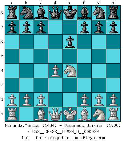 Last move : 1-0 2007 May 6 1:57:52 [Event "FICGS__CHESS__CLASS_D__000039"] [Site "FICGS"] [Date "2007.03.26"] [Round "1"] [White "Miranda,Marcus"] [Black "Desormes,Olivier"] [Result "1-0"] [WhiteElo "1434"] [BlackElo "1700"] 1.e4 e6 2.d4 d5 3.Nd2 dxe4 4.Nxe4 1-0 This chess game has been lost on time (started : 2007.03.26 19:3:8) French : Tarrasch Player White won this chess game. Follow this game move after move (download)Chess is really ninety nine percent calculation. (Soltis) Jeder leidlich begabte Spieler, er braucht keineswegs hervorragend veranlagt zu sein, kann es zum Meister bringen. Aber das ist ja auch gar nicht nötig! Der richtige Standpunkt ist es, zu seinem Vergnügen zu spielen, und man glaube ja nicht, dass der Genuss proportional dem Können sei. (Siegbert Tarrasch) Antes de los Finales, los dioses han colocado el Juego Medio. (Siegbert Tarrasch) Le moment que je préfère le plus dans une rencontre, c'est celui où je sens que la personnalité de l'adversaire se brise. (Robert Fischer) It's not the size of the dog in the fight, it's the size of the fight in the dog. (Mark Twain)