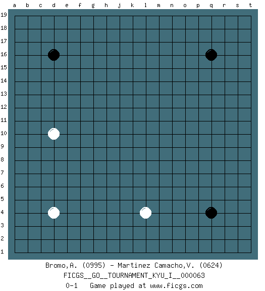 Last move : 0-1 2016 August 19 8:14:13 [Event "FICGS__GO__TOURNAMENT_KYU_I__000063"] [Site "FICGS"] [Date "2016.07.16"] [Round "1"] [Black "Bromo,Alexis"] [White "Martinez Camacho,Victor Hugo"] [Result "0-1"] [Rating 1 "0995"] [Rating 2 "0624"] 1.q16 d4 2.d16 d10 3.q4 l4 0-1 This go game has been lost on time (started : 2016.07.16 9:41:39) Here are the names of the openings (joseki) played in the four corners : Corner q4 : q4 l4 Hoshi (Hwajeom, Seongjeom, Xingwei`) 4-4 Point. The star or hoshi (4-4) point, emphasizing influence at the potential expense of territory. Player White won this Go (weiqi, baduk) game. Follow this game move after move (download)Take the cutting stone on the second line. (Anonymous) Ah, beer! The cause of, and the solution to, all of life's problems. (Homer Simpson)