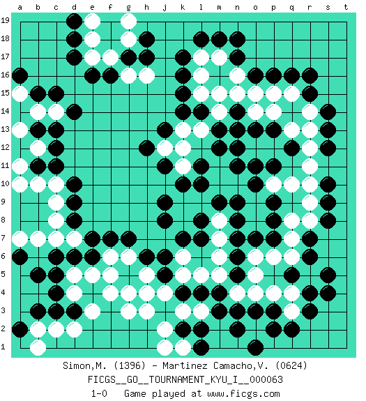 Last move : 1-0 2017 January 17 4:51:16 [Event "FICGS__GO__TOURNAMENT_KYU_I__000063"] [Site "FICGS"] [Date "2016.07.16"] [Round "1"] [Black "Simon,Mickael"] [White "Martinez Camacho,Victor Hugo"] [Result "1-0"] [Rating 1 "1396"] [Rating 2 "0624"] 1.r16 q13 2.d17 q4 3.c4 j4 4.c15 e5 5.d6 g4 6.e6 d4 7.d3 f4 8.k17 d5 9.c5 f5 10.p16 p15 11.o16 n15 12.r6 o5 13.s4 q6 14.r7 q8 15.k15 q10 16.r3 r5 17.s5 q15 18.q16 l15 19.k14 l16 20.k16 m15 21.d10 l13 22.g7 k13 23.j13 k12 24.p3 o4 25.o3 p4 26.n3 n4 27.m4 m5 28.l4 l5 29.k4 k5 30.j5 h4 31.j6 q7 32.l7 k6 33.k7 m6 34.l10 e3 35.s10 r8 36.s8 r9 37.s9 r11 38.l14 m14 39.m13 n13 40.m12 o15 41.n12 m11 42.l11 l9 43.j11 k11 44.k10 j12 45.h12 m7 46.n9 m10 47.m9 m8 48.l8 k9 49.j9 o9 50.n8 o8 51.n7 n10 52.o10 p10 53.o11 o12 54.n11 r10 55.s14 r13 56.n17 l17 57.l18 q3 58.q2 k3 59.m3 l3 60.r15 r14 61.s13 r12 62.s12 m17 63.m18 n16 64.n18 h5 65.h6 d2 66.c3 c2 67.o13 p12 68.o7 o6 69.p7 p6 70.n6 b2 71.b3 m2 72.n2 m1 73.p2 n1 74.j3 j2 75.n5 h3 76.n14 o14 77.n13 f6 78.f7 a3 79.c6 b4 80.b5 a4 81.p13 p14 82.p11 a5 83.a6 k8 84.j8 j1 85.q12 c10 86.c11 c9 87.d9 c8 88.d8 c7 89.b11 b10 90.p8 b7 91.a2 b1 92.p9 a7 93.q5 a10 94.r4 a11 95.b13 b12 96.c12 a13 97.c13 d7 98.e7 g6 99.o1 b14 100.b15 a15 101.a16 c14 102.d14 e17 103.d18 e18 104.e16 f17 105.f16 g16 106.h18 g18 107.h17 h16 108.g17 e19 109.d19 g19 110.l2 k1 111.l1 g3 112.k2 1-0 Here are the names of the openings (joseki) played in the four corners : Corner q16 : r16 q13 Komoku (Somok, Xiao~mu`) 3-4 Point. The komoku (3-4) point is the traditional corner enclosure move.. Corner d4 : c4 j4 Komoku (Somok, Xiao~mu`) 3-4 Point. The komoku (3-4) point is the traditional corner enclosure move.. Corner q4 : q4 r6 Hoshi (Hwajeom, Seongjeom, Xingwei`) 4-4 Point. The star or hoshi (4-4) point, emphasizing influence at the potential expense of territory. Ikken Kakari (Hankan Keolch'im, Yi Gua`jiao~, 1-Space Low Approach). Black 2 is the standard approach move to the 4-4. Player Black won this Go (weiqi, baduk) game. Follow this game move after move (download)When your opponent is thick, you must also become thick. (Otake Hideo, 9p) Life is painting a picture, not doing a sum. (Oliver Wendell Holmes, Jr.)