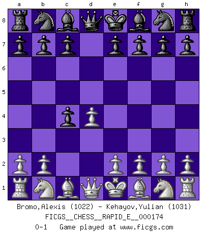 Last move : 0-1 2016 August 22 20:28:28 [Event "FICGS__CHESS__RAPID_E__000174"] [Site "FICGS"] [Date "2016.07.16"] [Round "1"] [White "Bromo,Alexis"] [Black "Kehayov,Yulian"] [Result "0-1"] [WhiteElo "1022"] [BlackElo "1031"] 1.d4 d5 2.c4 dxc4 0-1 This chess game has been lost on time (started : 2016.07.16 16:54:1) Queen's gambit accepted Player Black won this chess game. Follow this game move after move (download)Many Chess players were surprised when after the game, Fischer quietly explained: 'I had already analyzed this possibility' in a position which I thought was not possible to foresee from the opening. (Mikhail Tal) Die unerbitterlichsten Regeln im Schach sind die Ausnahmen. (Savielly Grigorievitsch Tartakower) Preferería tener un Peón que un dedo. (Reuben Fine) Tout change constamment, y compris dans le monde des Echecs. (Botvinnik) Better than a thousand days of diligent study is one day with a great teacher. (Japanese proverb)