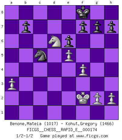 Last move : 1/2-1/2 2016 November 28 19:17:47 [Event "FICGS__CHESS__RAPID_E__000174"] [Site "FICGS"] [Date "2016.07.16"] [Round "1"] [White "Benone,Mateia"] [Black "Kohut,Gregory"] [Result "1/2-1/2"] [WhiteElo "1017"] [BlackElo "1466"] 1.e4 c5 2.c3 Nf6 3.e5 Nd5 4.d4 cxd4 5.cxd4 d6 6.Nf3 Nc6 7.Bc4 dxe5 8.dxe5 Be6 9.O-O Nc7 10.Qb3 Bxc4 11.Qxc4 e6 12.Nc3 Be7 13.Rd1 Qc8 14.Bf4 O-O 15.Rac1 Nb4 16.a3 Nbd5 17.Bg5 Qd8 18.Bxe7 Qxe7 19.Nxd5 Nxd5 20.Qc5 Qxc5 21.Rxc5 Rfc8 22.Rdc1 Ne7 23.Rxc8+ Rxc8 24.Rxc8+ Nxc8 25.Nd4 Kf8 26.f4 Nb6 27.Nb5 Nc4 28.b3 Nd2 29.Nxa7 Nxb3 30.Kf2 Ke7 31.Nc8+ Kf8 32.Nd6 Nc5 1/2-1/2 Sicilian : Alapin's variation (2.c3) Kingside Castling by player White (move 9) Kingside Castling by player Black (move 14) This chess game ended in a draw. Follow this game move after move (download)Nonsense was the last thing Fischer was interested in, as far as Chess was concerned. (Elie Agur) Alles was am Schachbrett zählt sind gute Züge. (Robert James Fischer) La belleza de un movimiento no se refleja solo en su apariencia, sino en el pensamiento detrás de él. (Siegbert Tarrasch) Un journaliste : 'Vous préférez avoir une dame de plus sur l'échiquier ou au lit ?' Boris Spassky : 'Ca dépend de la position.' The modern world has divided itself into Conservatives and Progressives. The business of Progressives is to go on making mistakes. The business of the Conservatives is to prevent the mistakes from being corrected. (G.K. Chesterton)