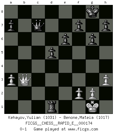 Last move : 0-1 2016 November 30 7:6:51 [Event "FICGS__CHESS__RAPID_E__000174"] [Site "FICGS"] [Date "2016.07.16"] [Round "1"] [White "Kehayov,Yulian"] [Black "Benone,Mateia"] [Result "0-1"] [WhiteElo "1031"] [BlackElo "1017"] 1.e4 c5 2.d4 cxd4 3.Qxd4 Nc6 4.Qd1 Nf6 5.Bd3 g6 6.Nf3 Bg7 7.O-O O-O 8.c4 d6 9.Nc3 Nd7 10.Bd2 Nc5 11.Be2 Bxc3 12.Bxc3 Nxe4 13.Qd3 Nxc3 14.Qxc3 Bg4 15.Rfe1 Re8 16.h3 Bxf3 17.Bxf3 Rc8 18.Bxc6 Rxc6 19.b3 Qc7 20.Re3 b5 21.Rc1 bxc4 22.bxc4 e6 23.Qb3 Rb8 24.Qd3 Rb4 25.a3 Rbxc4 26.Rxc4 Rxc4 27.Qb3 d5 28.Rd3 Rc1+ 29.Rd1 Rxd1+ 0-1 This chess game has been lost on time (started : 2016.07.16 16:54:1) Sicilian : Smith-Morra gambit Kingside Castling by player White (move 7) Kingside Castling by player Black (move 7) Player Black won this chess game. Follow this game move after move (download)The mistakes are there, waiting to be made. (Savielly Tartakower) Sitze auf Deine Hände. (Siegbert Tarrasch) La esencia del Ajedrez es pensar acerca de lo que el Ajedrez es. (David Bronstein) Toutes les manuvres exécutées sur une colonne ouverte ont pour but ultime l'intrusion définitive sur la septième ou la huitième rangée, en plein cur de la position ennemie. (Aaron Nimzovitch) If you ain't just a little scared when you enter a casino, you are either very rich or you haven't studied the games enough. (Pappy)