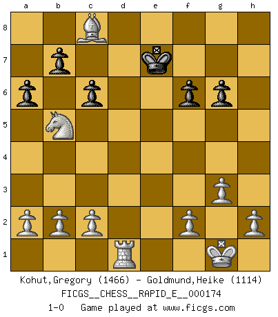 Last move : 1-0 2016 September 28 9:30:5 [Event "FICGS__CHESS__RAPID_E__000174"] [Site "FICGS"] [Date "2016.07.16"] [Round "1"] [White "Kohut,Gregory"] [Black "Goldmund,Heike"] [Result "1-0"] [WhiteElo "1466"] [BlackElo "1114"] 1.e4 d5 2.exd5 Qxd5 3.Nc3 Qa5 4.d4 Nf6 5.Nf3 Bf5 6.Bd2 c6 7.Bc4 Qc7 8.O-O e6 9.Nh4 Bg6 10.Nxg6 hxg6 11.g3 Bd6 12.Re1 Ke7 13.Bg5 Nbd7 14.d5 Rh5 15.Bxf6+ gxf6 16.dxe6 fxe6 17.Rxe6+ Kf8 18.Qxd6+ Qxd6 19.Rxd6 Ke7 20.Rad1 Rd8 21.Be6 Re5 22.Rxd7+ Rxd7 23.Bxd7 a6 24.Bc8 Rb5 25.Nxb5 1-0 Scandinavian defense Kingside Castling by player White (move 8) Player White won this chess game. Follow this game move after move (download)Fischer is the strongest player in the world. In fact, the strongest player who ever lived. (Larry Evans) Im Schach nämlich geht es darum, daß Ich des Gegners klein zu kriegen, sein Ego zu zerbrechen und zu zermahlen, seine Selbstachtung zu zertreten und zu verscharren und seine ganze mißachtenswerte sogenannte Persönlichkeit ein für alle Mal tot zu hacken und zu zerstampfen und dadurch die menschliche Gesellschaft von einer stinkenden Pestbeule zu befreien. Es ist ein königliches Spiel. (Robert James Fischer) Hoy en día, si tu no eres un Gran Maestro a los 14 años, es mejor que lo olvides. (Anand Viswanathan) La vérité est comme le meilleur coup aux échecs : elle existe, mais il faut la chercher. (Arturo Perez-Reverte) When you've done things right people won't know you've done anything at all. (Futurama)