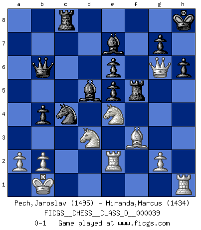 Last move : 0-1 2007 July 29 22:54:58 [Event "FICGS__CHESS__CLASS_D__000039"] [Site "FICGS"] [Date "2007.03.26"] [Round "1"] [White "Pech,Jaroslav"] [Black "Miranda,Marcus"] [Result "0-1"] [WhiteElo "1495"] [BlackElo "1434"] 1.e4 c5 2.Nf3 d6 3.d4 cxd4 4.Nxd4 Nf6 5.Nc3 a6 6.Bg5 e6 7.f4 Qb6 8.Nb3 Be7 9.Qf3 Nbd7 10.O-O-O Qc7 11.Be2 h6 12.Bxf6 Nxf6 13.Qg3 O-O 14.Nd4 Rb8 15.Bf3 Nd7 16.Bg4 Bf6 17.Kb1 Kh8 18.Rhf1 b5 19.e5 dxe5 20.f5 Nc5 21.fxe6 fxe6 22.Bf3 Bb7 23.Nb3 Na4 24.Ne4 Be7 25.Qg6 Bd5 26.Rf2 Rbc8 27.Rfd2 Nb6 28.h4 Nc4 29.Re2 Bxh4 30.Nbc5 Qe7 31.Nd3 Rf5 32.c3 Qf8 33.Qg4 Be7 34.Rh1 a5 35.Rhe1 b4 36.cxb4 axb4 37.Qg6 Qd8 38.Rh1 Qb6 0-1 Sicilian : Najdorf, 7...Qb6 Queenside Castling by player White (move 10) Kingside Castling by player Black (move 13) Player Black won this chess game. Follow this game move after move (download)You need not play well - just help your opponent to play badly. (Genrikh Chepukaitis) Ich verachte Kasparow. (Viktor Kortschnoi) Con o sin el título, Bobby Fischer fue sin lugar a dudas el mas grande jugador de su época. (Burt Hochberg) Les Echecs représentent une sphère d'idées créatrices basée sur la volonté des deux protagonistes. (Smyslov) Gambling : The sure way of getting nothing from something. (Wilson Mizner)