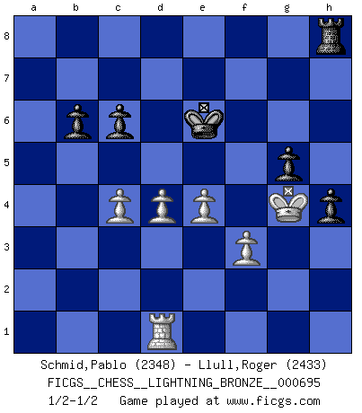 Last move : 1/2-1/2 2016 July 18 1:14:8 [Event "FICGS__CHESS__LIGHTNING_BRONZE__000695"] [Site "FICGS"] [Date "2016.07.18"] [Round "1"] [White "Schmid,Pablo"] [Black "Llull,Roger"] [Result "1/2-1/2"] [WhiteElo "2348"] [BlackElo "2433"] 1.e4 e5 2.Nf3 Nf6 3.Nxe5 d6 4.Nf3 Nxe4 5.d4 d5 6.Bd3 Nc6 7.O-O Be7 8.c4 O-O 9.cxd5 Qxd5 10.Nc3 Nxc3 11.bxc3 Bg4 12.Re1 Bxf3 13.Qxf3 Qxf3 14.gxf3 Bd6 15.Be3 Ne7 16.c4 Ng6 17.Rab1 b6 18.a4 Rad8 19.a5 Nf4 20.Be4 Ne6 21.Bc6 g5 22.Bd5 Rfe8 23.Kh1 h6 24.h4 Kg7 25.Rg1 Bf4 26.Rb3 Kf8 27.Rd1 gxh4 28.Bxe6 Bxe3 29.Bxf7 Kxf7 30.fxe3 Rg8 31.Rb5 Rg5 32.Kh2 c6 33.Rxg5 hxg5 34.axb6 axb6 35.Kh3 Ke6 36.e4 Rf8 37.Kg4 Rh8 1/2-1/2 Petrov : Classical attack Kingside Castling by player White (move 7) Kingside Castling by player Black (move 8) This chess game ended in a draw. Follow this game move after move (download)Adequate compensation for a sacrifice is having a sound combination leading to a winning position; adequate compensation for a blunder is having your opponent snatch defeat from the jaws of victory. (Bruce A. Moon) Über die Verhaftung Bobby Fischers: Warum es die Bush-Administration für nötig befindet einen 61 Jahre alten Mann zu hetzten, der für niemanden ausser sich selbste eine Gefahr darstellt ist ein Rätsel. (Nigel Short) La esencia del Ajedrez es pensar acerca de lo que el Ajedrez es. (David Bronstein) Les pièces de l'échiquier étaient impitoyables. Elles le retenaient, elles l'absorbaient. Il y avait de l'horreur en cela, mais aussi une harmonie unique. Car, qu'y a-t-il dans le monde, à part les échecs ? (V. Nabokov) There is no instance of a country having benefited from prolonged warfare. (Sun Tzu)