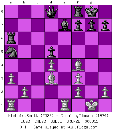 Last move : 0-1 2016 July 18 14:52:56 [Event "FICGS__CHESS__BULLET_BRONZE__000912"] [Site "FICGS"] [Date "2016.07.18"] [Round "1"] [White "Nichols,Scott"] [Black "Cirulis,Ilmars"] [Result "0-1"] [WhiteElo "2332"] [BlackElo "1974"] 1.Nf3 a6 2.d4 e6 3.e4 d5 4.Nbd2 Nf6 5.Bd3 c5 6.c3 cxd4 7.cxd4 dxe4 8.Nxe4 Be7 9.O-O Bd7 10.Nc3 Nc6 11.a3 Rc8 12.Be3 O-O 13.Re1 Nd5 14.Nxd5 exd5 15.Qb3 Bg4 16.Qxb7 Na5 17.Qxa6 Bxf3 18.gxf3 Ra8 19.Bf4 Rxa6 0-1 Reti Opening Kingside Castling by player White (move 9) Kingside Castling by player Black (move 12) Player Black won this chess game. Follow this game move after move (download)Weak points or holes in the opponent's position must be occupied by pieces not Pawns. (Siegbert Tarrasch) Zum Sieg gelangt man nicht, wenn man gut, sondern nur wenn man besser spielt (Savielly Grigorievitsch Tartakower) El Ajedrez, como cualquier otra actividad creativa, puede existir solo a través de méritos combinados de aquellos que tienen talento creativo y de aquellos que tienen la habilidad de organizar un trabajo creativo. (Mikhail Botvinnik) Le thème de l'attaque double intervient d'une manière ou d'une autre dans l'immense majorité des combinaisons. (Youri Averbakh) Unless in communicating with it one says exactly what one means, trouble is bound to result. (Alan Turing, about computers)