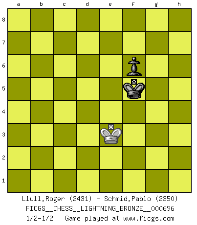 Last move : 1/2-1/2 2016 July 20 1:13:25 [Event "FICGS__CHESS__LIGHTNING_BRONZE__000696"] [Site "FICGS"] [Date "2016.07.19"] [Round "1"] [White "Llull,Roger"] [Black "Schmid,Pablo"] [Result "1/2-1/2"] [WhiteElo "2431"] [BlackElo "2350"] 1.g3 e5 2.d3 d5 3.Bg2 Nf6 4.Nf3 Bd6 5.O-O O-O 6.Nc3 c6 7.e4 d4 8.Ne2 c5 9.Nh4 Nc6 10.f4 b5 11.Nf5 Bxf5 12.fxe5 Bxe5 13.exf5 Rc8 14.Nf4 Nb4 15.a4 a6 16.axb5 axb5 17.Nh5 c4 18.Nxf6+ Bxf6 19.Bb7 Rc7 20.Ra8 Qe7 21.Re1 Qd7 22.Rxf8+ Kxf8 23.Be4 cxd3 24.Bxd3 Nxd3 25.Qxd3 h6 26.Bf4 Rc5 27.g4 Kg8 28.Re2 b4 29.Bg3 Qc6 30.Bf2 Ra5 31.Re1 Ra2 32.Rb1 Qa4 33.Kg2 Qa8+ 34.Qf3 Qe8 35.h4 d3 36.cxd3 Qd8 37.d4 Bxh4 38.Kh3 Bxf2 39.Qxf2 Qd5 40.Re1 Ra8 41.Qe3 Rd8 42.Qd3 Rd6 43.Kg3 Qxd4 44.Qxd4 Rxd4 45.Re8+ Kh7 46.Re3 h5 47.gxh5 f6 48.Re2 Kh6 49.Rg2 Kxh5 50.Kf3 Kh6 51.Rg6+ Kh7 52.Rg2 Rh4 53.Kg3 Rc4 54.Kf3 b3 55.Ke3 Rc5 56.Rh2+ Kg8 57.Rf2 Kf7 58.Kd3 Ke7 59.Rg2 Kd6 60.Rxg7 Rc2 61.Rb7 Rxb2 62.Kc3 Rb1 63.Rb5 b2 64.Kc2 Rc1+ 65.Kxb2 Rc5 66.Rxc5 Kxc5 67.Kc3 Kd5 68.Kd3 Ke5 69.Ke3 Kxf5 1/2-1/2 Benko's Opening Kingside Castling by player White (move 5) Kingside Castling by player Black (move 5) 10 pieces endgame at move 47 : White KRPPP , Black KRPPP WHITE : King + 1 Rook 3 Pawns BLACK : King + 1 Rook 3 Pawns 9 pieces endgame at move 49 : White KRPP , Black KRPPP WHITE : King + 1 Rook 2 Pawns BLACK : King + 1 Rook 3 Pawns 8 pieces endgame at move 60 : White KRPP , Black KRPP WHITE : King + 1 Rook 2 Pawns BLACK : King + 1 Rook 2 Pawns 7 pieces endgame at move 61 : White KRP , Black KRPP WHITE : King + 1 Rook 1 Pawn BLACK : King + 1 Rook 2 Pawns 6 pieces endgame at move 65 : White KRP , Black KRP WHITE : King + 1 Rook 1 Pawn BLACK : King + 1 Rook 1 Pawn 5 pieces endgame at move 66 : White KRP , Black KP WHITE : King + 1 Rook 1 Pawn BLACK : King + 1 Pawn 4 pieces endgame at move 66 : White KP , Black KP WHITE : King + 1 Pawn BLACK : King + 1 Pawn 3 pieces endgame at move 69 : White K , Black KP WHITE : King + BLACK : King + 1 Pawn This chess game ended in a draw. Follow this game move after move (download)He who fears an isolated Queen's Pawn should give up Chess. (Siegbert Tarrasch) Als er Schachweltmeister wurde ließ er praktisch alle stärksten Sovietspieler für sich arbeiten. Wenn ein auch nur mittelmässiger Meister ein Spezialist für eine bestimmte Eröffnung war, wurde er von Karpov gerufen. Das wurde alles geheim gehalten. (Mikhail Moiseyevich Botvinik) Me siento como si fuera una pieza en una partida de Ajedrez, cuando mi oponente me indica: esa pieza no puede ser movida. (Soren Kierkegaard) Des idées, des idées, j'en ai cent, j'en ai mille. Des bonnes, des mauvaises, applicables, irréalisables... Il suffit de faire le tri ! (Roos) Knowledge will give you power, but character respect. (Bruce Lee)