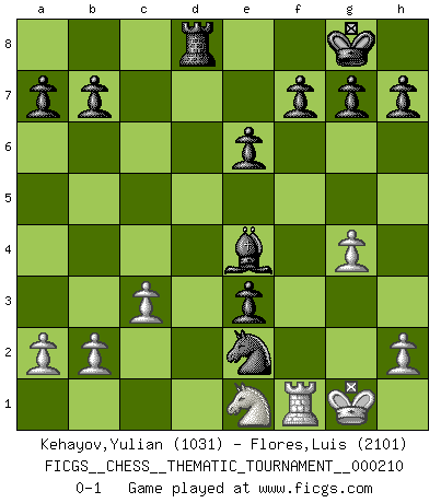 Last move : 0-1 2016 August 7 8:10:8 [Event "FICGS__CHESS__THEMATIC_TOURNAMENT__000210"] [Site "FICGS"] [Date "2016.07.20"] [Round "1"] [White "Kehayov,Yulian"] [Black "Flores,Luis"] [Result "0-1"] [WhiteElo "1031"] [BlackElo "2101"] 1.d4 Nf6 2.Bg5 Ne4 3.Bc1 d5 4.e3 Bf5 5.Nf3 e6 6.Bd2 c5 7.dxc5 Bxc5 8.Be2 Nc6 9.O-O O-O 10.Nc3 Rc8 11.Nxe4 dxe4 12.Ne1 Qg5 13.f3 Bxe3+ 14.Bxe3 Qxe3+ 15.Rf2 Rfd8 16.Qc1 Qxc1 17.Rxc1 e3 18.Rf1 Nd4 19.Bc4 Rxc4 20.c3 Ne2+ 21.Kh1 Nxc1 22.g4 Rxg4 23.fxg4 Be4+ 24.Kg1 Ne2+ 0-1 Trompowsky attack (Ruth, Opovcensky Opening) Kingside Castling by player White (move 9) Kingside Castling by player Black (move 9) Player Black won this chess game. Follow this game move after move (download)If a ruler does not understand Chess, how can he rule over a kingdom ? (King Khusros II) Pläne sind die Träume des Verständigen. (Ernst Freiherr von Feuchtersleben) Bendita sea la memoria de aquel que dio al mundo este juego inmortal. (A. G. Gardiner) D'abord les bases : Jouez et étudiez, puis étudiez et jouez, ensuite jouez et étudiez, puis étudiez et jouez. Deuxièmement : Donnez toujours le meilleur de vous-même ! (Ken Smith) To err is human, to shift the blame on someone else is tactical. (Mladen Jankovic)