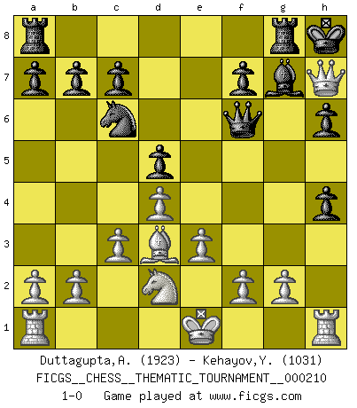 Last move : 1-0 2016 October 25 7:30:31 [Event "FICGS__CHESS__THEMATIC_TOURNAMENT__000210"] [Site "FICGS"] [Date "2016.07.20"] [Round "1"] [White "Duttagupta,Aniruddha"] [Black "Kehayov,Yulian"] [Result "1-0"] [WhiteElo "1923"] [BlackElo "1031"] 1.d4 Nf6 2.Bg5 h6 3.Bxf6 exf6 4.e3 Be7 5.Nd2 O-O 6.Nh3 d5 7.Nf4 Nc6 8.c3 g5 9.Nh5 Kh7 10.Ng3 f5 11.Bd3 Kg7 12.Nxf5+ Bxf5 13.Bxf5 Bf6 14.h4 gxh4 15.Qg4+ Kh8 16.Bd3 Rg8 17.Qh5 Bg7 18.Qf5 Qf6 19.Qh7+ 1-0 Trompowsky attack (Ruth, Opovcensky Opening) Kingside Castling by player Black (move 5) Player White won this chess game. Follow this game move after move (download)A good player is always lucky. (Jose Raul Capablanca) Der 70jährige Viktor Kortschnoi: Die Rentenanstalt wollte mich zwingen in Rente zu gehen. Meine Frau erhält jetzt eine Pension- und ich zahle weiter in die Rentenkasse ein! (Viktor Kortschnoi) ¿Se han dado cuenta de que Fischer casi nunca ha tenido piezas malas? El las intercambia y las piezas malas se quedan con sus oponenets. (Yuri Balashov) Il n'y a pas de prix trop élevé au scalp de l'ennemi. (Koblentz) Don't be discouraged. It's often the last key in the bunch that opens the lock. (Author unknown)