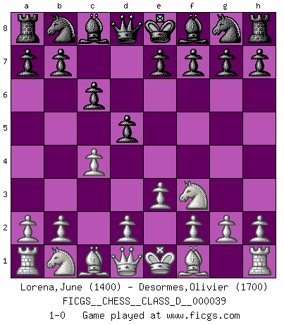 Last move : 1-0 2007 May 9 20:29:24 [Event "FICGS__CHESS__CLASS_D__000039"] [Site "FICGS"] [Date "2007.03.26"] [Round "1"] [White "Lorena,June"] [Black "Desormes,Olivier"] [Result "1-0"] [WhiteElo "1400"] [BlackElo "1700"] 1.c4 c6 2.e3 d5 3.Nf3 1-0 This chess game has been lost on time (started : 2007.03.26 19:3:8) English : Caro-Kann defensive system Player White won this chess game. Follow this game move after move (download)I have always a slight feeling of pity for the man who has no knowledge of Chess. (Siegbert Tarrasch) Herr Iljumschinow ist ein etwas merkwürdiger Geschäftsmann: Er arbeitet zusammen mit Leuten wie Muammar al-Gaddafi; früher ist das Saddam Hussein gewesen. (Joel Lautier) Todo se encuentra en un estado de flujo y esto incluye al mundo del Ajedrez. (Mikhail Botvinnik) Je ne crois pas en la psychologie, je crois aux bons coups. (Robert Fischer) A bird doesn't sing because it has an answer, it sings because it has a song. (Maya Angelou)