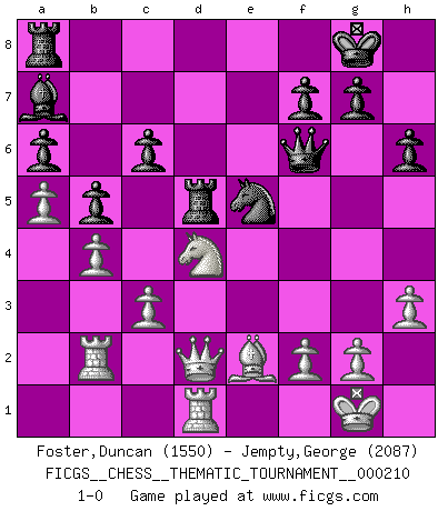 Last move : 1-0 2016 December 24 21:20:4 [Event "FICGS__CHESS__THEMATIC_TOURNAMENT__000210"] [Site "FICGS"] [Date "2016.07.20"] [Round "1"] [White "Foster,Duncan"] [Black "Jempty,George"] [Result "1-0"] [WhiteElo "1550"] [BlackElo "2087"] 1.d4 Nf6 2.Bg5 e6 3.e4 h6 4.Bxf6 Qxf6 5.Nc3 Bb4 6.Qd3 d6 7.a3 Ba5 8.Nf3 Nd7 9.Be2 c6 10.O-O O-O 11.b4 Bc7 12.Rfd1 Qe7 13.Rab1 a6 14.h3 b5 15.Qe3 e5 16.a4 Bb6 17.a5 Ba7 18.Qd2 Rd8 19.dxe5 Nxe5 20.Nd4 Qf6 21.Rb3 Be6 22.Rb2 d5 23.exd5 Bxd5 24.Nxd5 Rxd5 25.c3 1-0 Trompowsky attack (Ruth, Opovcensky Opening) Kingside Castling by player White (move 10) Kingside Castling by player Black (move 10) Player White won this chess game. Follow this game move after move (download)It is not enough to be a good player... you must also play well. (Siegbert Tarrasch) Wenn Dein Gegner dir ein Remis anbietet, versuch herauszufinden, weshalb er glaubt schlechter zu stehen. (Nigel Short) Coloca el contenido del tablero de Ajedrez en un sombrero, agita las piezas vigorosamente, derrámalas en el tablero desde una altura de medio metro y así obtienes el estilo de Wilhelm Steinitz. (H. E. Bird) Les échecs c'est le défi de l'alpiniste, toujours plus haut, prêt à tout pour monter à l'assaut du Roi ennemi. Les échecs, c'est de la musique en mouvement, un ballet majestueux pour les yeux. C'est de la poésie composée par les fantômes du passé qui au même titre que Rimbaud ou Verlaine méritent notre admiration. Les échecs, c'est de la peinture ou le moindre mouvement modifie le tableau pour en faire un Picasso ou un Van Gogh. Les échecs, c'est tout et rien, c'est la vie et la mort. Jjulie33 sur le forum de France-Echecs. Computers are like Old Testament gods; lots of rules and no mercy. (Joseph Campbell)