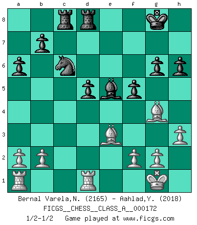 Last move : 1/2-1/2 2016 December 24 15:1:57 [Event "FICGS__CHESS__CLASS_A__000172"] [Site "FICGS"] [Date "2016.07.21"] [Round "1"] [White "Bernal Varela,Nelson"] [Black "Aahlad,Yeturu"] [Result "1/2-1/2"] [WhiteElo "2165"] [BlackElo "2018"] 1.e4 c5 2.Nf3 d6 3.d4 cxd4 4.Qxd4 Nc6 5.Qe3 g6 6.h3 Bg7 7.Be2 Nf6 8.O-O Nd7 9.Rd1 O-O 10.Nc3 a6 11.Nd5 Re8 12.Qg5 h6 13.Qg3 Nc5 14.Qh4 e6 15.Qxd8 Rxd8 16.Nb6 Rb8 17.e5 d5 18.Be3 Nd7 19.c4 Ndxe5 20.Nxe5 Bxe5 21.cxd5 exd5 22.Nxc8 Rbxc8 23.Bg4 f5 1/2-1/2 Sicilian, Chekhover variation Kingside Castling by player White (move 8) Kingside Castling by player Black (move 9) This chess game ended in a draw. Follow this game move after move (download)When you don't know what to play, wait for an idea to come into your opponent's mind. You may be sure that idea will be wrong. (Siegbert Tarrasch) Du kannst im Schach nur gut werden, wenn du das Spiel liebst. (Robert James Fischer) No hay otro maestro que tenga una voluntad terrífica de ganar. Al tablero, el irradía peligro y aún los oponentes mas fuertes tienden a congelarse como liebres cuando olfatean a una pantera. Aún sus debilidades son peligrosas. Con las blancas, su juego de apertura es predecible - te es posible hacer planes en su contra - pero es tan fuerte que tus planes casi nunca funcionan. En el juego medio, su precisión e invención son fabulosas y en finales, tú simplemente no le puedes vencer. (Experto Alemán anónimo) Les échecs sont un jeu par leur forme, un art par leur essence et une science par sa difficulté d'acquisition. Ils peuvent vous procurer autant de plaisir qu'un bon livre ou une belle musique, mais vous n'aurez une réelle joie que si vous arrivez à bien jouer. (Tigran Petrosian) Tomorrow's what you make of it. (Horatio Caine, C.S.I. Miami)