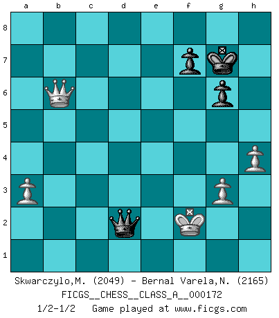 Last move : 1/2-1/2 2017 January 8 0:31:42 [Event "FICGS__CHESS__CLASS_A__000172"] [Site "FICGS"] [Date "2016.07.21"] [Round "1"] [White "Skwarczylo,Marek"] [Black "Bernal Varela,Nelson"] [Result "1/2-1/2"] [WhiteElo "2049"] [BlackElo "2165"] 1.d4 Nf6 2.c4 e6 3.Nc3 Bb4 4.e3 O-O 5.Bd3 d5 6.Nge2 dxc4 7.Bxc4 c5 8.a3 Bxc3+ 9.Nxc3 cxd4 10.exd4 Nc6 11.Be3 b6 12.O-O Bb7 13.Ba2 Ne7 14.Bg5 Nf5 15.d5 exd5 16.Bxd5 Bxd5 17.Bxf6 Qxf6 18.Qxd5 g6 19.h3 Kg7 20.Rfe1 Rad8 21.Qb7 Nd4 22.Rad1 Rfe8 23.Rxe8 Rxe8 24.Kf1 Re7 25.Qa6 Rd7 26.Ne2 Rd6 27.Nxd4 Rxd4 28.Rxd4 Qxd4 29.Qe2 h5 30.g3 h4 31.Kg2 hxg3 32.fxg3 a5 33.h4 a4 34.Qc2 Qf6 35.b3 axb3 36.Qxb3 Qe5 37.Qxb6 Qd5+ 38.Kf2 Qd2+ 39.Kf3 Qd1+ 40.Kg2 Qd5+ 41.Kf2 Qd2+ 42.Kf3 Qd1+ 43.Kf2 Qd2+ 1/2-1/2 Nimzo-Indian : 4.e3 O-O, 5.Bd3 d5 Kingside Castling by player Black (move 4) Kingside Castling by player White (move 12) 10 pieces endgame at move 36 : White KQPPP , Black KQPPP WHITE : King + 1 Queen 3 Pawns BLACK : King + 1 Queen 3 Pawns 9 pieces endgame at move 37 : White KQPPP , Black KQPP WHITE : King + 1 Queen 3 Pawns BLACK : King + 1 Queen 2 Pawns This chess game ended in a draw. Follow this game move after move (download)You need not play well - just help your opponent to play badly. (Genrikh Chepukaitis) Ich verstehe den Grund nicht, warum die Aufteilung in Frauen und Männer überhaupt im Schach besteht. (Judith Polgar) El Ajedrez detiene a su maestro dentro de sus propios vínculos, encadenando la mente y el cerebro, por lo que la libertad interior del mas fuerte debe sufrir. (Albert Einstein) Ce qui caractérise les parties de combat, c'est que si le défenseur a constamment de difficiles problèmes à résoudre, l'attaquant doit chercher sans relâche de nouvelles possibilités d'attaque. (Koblentz) It's unlucky to be superstitious. (Dave Enteles)
