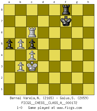 Last move : 1-0 2016 December 11 7:2:29 [Event "FICGS__CHESS__CLASS_A__000172"] [Site "FICGS"] [Date "2016.07.21"] [Round "1"] [White "Bernal Varela,Nelson"] [Black "Galus,Stanislaw"] [Result "1-0"] [WhiteElo "2165"] [BlackElo "2059"] 1.e4 e6 2.d4 d5 3.Nd2 dxe4 4.Nxe4 Nd7 5.Bd3 Ngf6 6.Nxf6+ Nxf6 7.Nf3 c5 8.Be3 Qc7 9.Qe2 Bd6 10.Bb5+ Bd7 11.Bxd7+ Nxd7 12.d5 e5 13.Nd2 O-O-O 14.O-O-O f5 15.Nc4 Nb6 16.Nxd6+ Qxd6 17.Rhe1 Nd7 18.f3 Rhe8 19.Bg5 Nf6 20.Qd3 Qd7 21.c4 b6 22.a4 a5 23.Qb3 Kb7 24.Re2 Re7 25.Qb5 Qxb5 26.axb5 Rde8 27.g4 Rf7 28.Bxf6 Rxf6 29.g5 Rf7 30.Rde1 Rfe7 31.d6 Re6 32.d7 Rd8 33.Rxe5 Rd6 34.Rxf5 R8xd7 35.Rfe5 h6 36.h4 hxg5 37.hxg5 Kc7 38.Re7 Rd1+ 39.Kc2 R1d2+ 40.Kb3 Kd8 41.R7e6 R2d3+ 42.Ka4 R3d6 43.f4 Kc7 44.Rxd6 Kxd6 45.f5 Re7 46.Rd1+ Kc7 47.Rh1 Re5 48.Rf1 Re8 49.f6 gxf6 50.gxf6 Rd8 51.f7 Rf8 52.Rf6 Kb7 53.Kb3 Kc7 54.Kc3 Kd8 55.b3 Ke7 56.Rxb6 Kxf7 57.Rc6 1-0 French : Tarrasch Queenside Castling by player Black (move 13) Queenside Castling by player White (move 14) 10 pieces endgame at move 56 : White KRPPPP , Black KRPP WHITE : King + 1 Rook 4 Pawns BLACK : King + 1 Rook 2 Pawns 9 pieces endgame at move 56 : White KRPPP , Black KRPP WHITE : King + 1 Rook 3 Pawns BLACK : King + 1 Rook 2 Pawns Player White won this chess game. Follow this game move after move (download)In Chess, just as in life, today's bliss may be tomorrow's poison. (Assaic) In der Schule lernt man nichts. Es ist nur Zeitverschwendung. (Robert James Fischer) Combinaciones deslumbrantes son para la mayoría, mover madera es para los pocos. (Georg Kieninger) Toutes choses étant égales, c'est la conviction qui gagne. Alliée à une volonté de vaincre, elle sert de détonateur, suscite des idées, disperse les doutes et aide à penser clairement. (Robert Fischer) In my experience, there's no such thing as luck. (Obi-Wan Kenobi in Star Wars ep.4)
