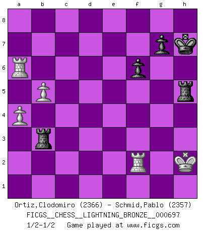 Last move : 1/2-1/2 2016 July 21 22:11:6 [Event "FICGS__CHESS__LIGHTNING_BRONZE__000697"] [Site "FICGS"] [Date "2016.07.21"] [Round "1"] [White "Ortiz,Clodomiro"] [Black "Schmid,Pablo"] [Result "1/2-1/2"] [WhiteElo "2366"] [BlackElo "2357"] 1.c4 Nf6 2.d4 e6 3.Nc3 d5 4.Bg5 Be7 5.e3 O-O 6.Qc2 h6 7.Bxf6 Bxf6 8.Rd1 b6 9.Nf3 Bb7 10.cxd5 exd5 11.Bd3 Nd7 12.O-O Be7 13.Bh7+ Kh8 14.Bf5 Kg8 15.a3 Nf6 16.Ne5 Bd6 17.f4 Qe7 18.Rf3 c5 19.Rh3 Rfe8 20.Qf2 cxd4 21.exd4 Bc8 22.g4 Ne4 23.Nxd5 Nxf2 24.Nxe7+ Rxe7 25.Kxf2 f6 26.Nc6 Rc7 27.Rc3 Bxf5 28.gxf5 Bxf4 29.h4 h5 30.Kf3 Bd6 31.Re1 Kf7 32.Re6 Rd7 33.Ke4 Bf8 34.Rd3 Bd6 35.a4 Bh2 36.d5 Bd6 37.Rf3 Rc8 38.Kd4 a6 39.Kc4 Rg8 40.b4 Rc8 41.Rfe3 Bf8 42.Rd3 Bd6 43.b5 a5 44.Kd4 Bf8 45.Ke4 Bd6 46.Rc3 Ra8 47.Nd4 Rad8 48.Rc4 Rf8 49.Rc6 Rfd8 50.Ne2 Bc5 51.Nf4 Bd6 52.Nxh5 Be5 53.Nf4 Bxf4 54.Kxf4 Rxd5 55.Rxb6 Rd1 56.Re4 Rf1+ 57.Kg4 Rd3 58.Ra6 Kg8 59.Re8+ Kh7 60.Rxa5 Rdf3 61.Re2 Rxf5 62.Kg3 R1f3+ 63.Kg2 Rb3 64.Rf2 Rc5 65.h5 Rxh5 66.Ra6 Rg5+ 67.Kh2 Rh5+ 68.Kg1 Rg5+ 69.Kh2 Rh5+ 70.Kg1 Rg5+ 71.Kh2 Rh5+ 1/2-1/2 English, 1...Nf6 (Anglo-Indian defense) Kingside Castling by player Black (move 5) Kingside Castling by player White (move 12) 10 pieces endgame at move 65 : White KRRPP , Black KRRPP WHITE : King + 2 Rooks 2 Pawns BLACK : King + 2 Rooks 2 Pawns This chess game ended in a draw. Follow this game move after move (download)I have never in my life played the French Defence, which is the dullest of all openings. (Wilhelm Steinitz) Wer der Ansicht ist, daß alle Schachspieler verrückt sind, wird durch Studium des Lebens von Emil Josef Diemer nicht auf andere Gedanken kommen. (Hans Ree) La mitad de las variaciones que son calculadas en una partida de torneo, resultan ser completamente superfluas. Desafortunadamente, nadie sabe por adelantado cual mitad. (Jan Tinman) J'ai toujours senti une vague pitié pour l'homme qui ne connaît rien aux échecs, tout comme j'en aurais pour un homme ignorant de l'amour. Les Echecs, comme la musique ou comme l'amour, ont le pouvoir de rendre heureux. (Siegbert Tarrasch) Chess is everything: art, science and sport. (Anatoly Karpov)