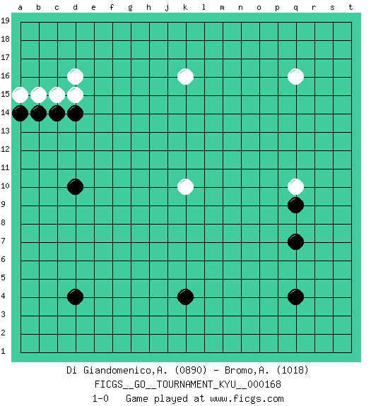 Last move : 1-0 2016 September 28 11:19:42 [Event "FICGS__GO__TOURNAMENT_KYU__000168"] [Site "FICGS"] [Date "2016.08.01"] [Round "1"] [Black "Di Giandomenico,Alfonso"] [White "Bromo,Alexis"] [Result "1-0"] [Rating 1 "0890"] [Rating 2 "1018"] 1.d4 q16 2.q4 d16 3.k4 k16 4.d10 q10 5.d14 d15 6.c14 c15 7.b14 b15 8.a14 a15 9.q9 k10 10.q7 1-0 This go game has been lost on time (started : 2016.08.01 1:51:5) Here are the names of the openings (joseki) played in the four corners : Corner d16 : d16 d14 Hoshi (Hwajeom, Seongjeom, Xingwei`) 4-4 Point. The star or hoshi (4-4) point, emphasizing influence at the potential expense of territory. Ikken Takagakari (Hankan Nop'dakeolch'im, Yi Gaojia, 1-Space High Approach). White typically responds at 6-4 or 3-10. White 4-10 is played when White finds play on the right side advantageous. White 4-8 or 3-8 may be played when White has support at top. Player Black won this Go (weiqi, baduk) game. Follow this game move after move (download)The rectangular six is normally alive. (Anonymous) A shortcut is the longest distance between two points. (Don Groves)