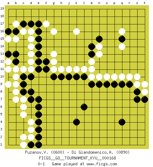 Last move : 0-1 2016 December 22 15:57:8 [Event "FICGS__GO__TOURNAMENT_KYU__000168"] [Site "FICGS"] [Date "2016.08.01"] [Round "1"] [Black "Puzanov,Vasyl"] [White "Di Giandomenico,Alfonso"] [Result "0-1"] [Rating 1 "0600"] [Rating 2 "0890"] 1.k4 q16 2.q15 d16 3.d10 k16 4.k10 q10 5.q9 d4 6.e5 c5 7.e4 d3 8.e3 d2 9.e2 c6 10.e6 c11 11.c10 b11 12.d7 c7 13.c8 d11 14.e11 d12 15.d1 c1 16.e1 c2 17.e7 b8 18.c9 b9 19.a10 b10 20.a11 a12 21.b12 a9 22.b13 a11 23.a13 k11 24.e12 d13 25.e13 d14 26.e14 d15 27.d17 j11 28.j10 l11 29.l10 m11 30.q4 m10 31.m9 n10 32.n9 o10 33.o9 p10 34.p9 r10 35.r9 s10 36.e16 c16 37.b16 b15 38.a16 a15 39.e15 h11 40.e17 g16 41.d8 g12 42.h10 g11 43.g10 s9 44.s8 t8 45.t7 t9 46.s7 q14 47.c17 b7 48.f12 g13 49.f11 b17 50.l6 f17 51.n15 n14 52.m14 n13 53.m13 m12 0-1 Here are the names of the openings (joseki) played in the four corners : Corner q16 : q16 q15 Hoshi (Hwajeom, Seongjeom, Xingwei`) 4-4 Point. The star or hoshi (4-4) point, emphasizing influence at the potential expense of territory. Corner d4 : d4 e5 Hoshi (Hwajeom, Seongjeom, Xingwei`) 4-4 Point. The star or hoshi (4-4) point, emphasizing influence at the potential expense of territory. Player White won this Go (weiqi, baduk) game. Follow this game move after move (download)The L-group is dead. (Anonymous) Nowadays, anyone who cannot speak English and is incapable of using the Internet is regarded as backward. (Al-Waleed bin Talal)
