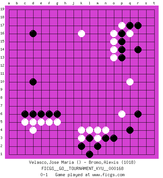 Last move : 0-1 2016 October 4 23:27:35 [Event "FICGS__GO__TOURNAMENT_KYU__000168"] [Site "FICGS"] [Date "2016.08.01"] [Round "1"] [Black "Velasco,Jose Maria"] [White "Bromo,Alexis"] [Result "0-1"] [Rating 2 "1018"] 1.d10 q16 2.q4 d4 3.d16 k16 4.r14 q10 5.r17 k4 6.q17 p17 7.p16 o16 8.p15 o15 9.p14 o14 10.p13 o13 11.c6 c5 12.d6 d5 13.e6 e5 14.f6 f5 15.g6 g5 16.r6 p6 17.o3 n4 18.n3 m3 19.m2 l2 20.l3 m4 21.k2 l4 22.l1 k3 0-1 Here are the names of the openings (joseki) played in the four corners : Corner q16 : q16 r14 Hoshi (Hwajeom, Seongjeom, Xingwei`) 4-4 Point. The star or hoshi (4-4) point, emphasizing influence at the potential expense of territory. Ikken Kakari (Hankan Keolch'im, Yi Gua`jiao~, 1-Space Low Approach). Black 2 is the standard approach move to the 4-4. Corner d4 : d4 c6 Hoshi (Hwajeom, Seongjeom, Xingwei`) 4-4 Point. The star or hoshi (4-4) point, emphasizing influence at the potential expense of territory. Ikken Kakari (Hankan Keolch'im, Yi Gua`jiao~, 1-Space Low Approach). Black 2 is the standard approach move to the 4-4. Player White won this Go (weiqi, baduk) game. Follow this game move after move (download)The weak player fears ko, the strong player seeks it. (Bill Taylor) The question of whether computers can think is just like question of whether submarines can swim. (Edsger W. Dijkstra)