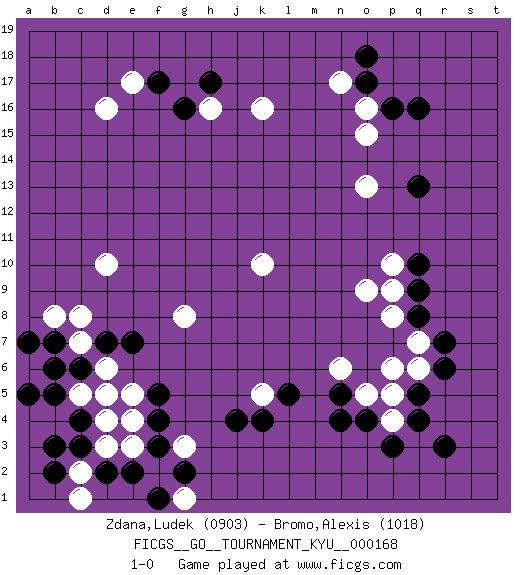 Last move : 1-0 2016 October 19 1:3:51 [Event "FICGS__GO__TOURNAMENT_KYU__000168"] [Site "FICGS"] [Date "2016.08.01"] [Round "1"] [Black "Zdana,Ludek"] [White "Bromo,Alexis"] [Result "1-0"] [Rating 1 "0903"] [Rating 2 "1018"] 1.q16 d4 2.q4 d16 3.q10 k16 4.k4 d10 5.f3 e3 6.c3 d3 7.f5 e5 8.f4 e4 9.b5 c5 10.c4 b6 11.a5 a6 12.c6 d5 13.b3 c2 14.b7 c7 15.a7 d6 16.b2 c1 17.b6 b8 18.d7 c8 19.e7 f2 20.g2 g1 21.e2 k10 22.d2 g3 23.f1 g8 24.f17 e17 25.g16 h16 26.h17 o13 27.q13 o15 28.o17 n17 29.p16 o16 30.o18 o9 31.q8 n6 32.n4 k5 33.j4 p5 34.q5 p4 35.p3 q6 36.r6 q7 37.r7 p8 38.q9 p9 39.o4 o5 40.n5 p6 41.r3 p10 42.l5 1-0 This go game has been lost on time (started : 2016.08.01 1:51:5) Here are the names of the openings (joseki) played in the four corners : Corner d4 : d4 f3 Hoshi (Hwajeom, Seongjeom, Xingwei`) 4-4 Point. The star or hoshi (4-4) point, emphasizing influence at the potential expense of territory. Ikken Kakari (Hankan Keolch'im, Yi Gua`jiao~, 1-Space Low Approach). Black 2 is the standard approach move to the 4-4. Corner d16 : d16 f17 Hoshi (Hwajeom, Seongjeom, Xingwei`) 4-4 Point. The star or hoshi (4-4) point, emphasizing influence at the potential expense of territory. Ikken Kakari (Hankan Keolch'im, Yi Gua`jiao~, 1-Space Low Approach). Black 2 is the standard approach move to the 4-4. Corner q16 : q16 o13 Hoshi (Hwajeom, Seongjeom, Xingwei`) 4-4 Point. The star or hoshi (4-4) point, emphasizing influence at the potential expense of territory. Corner q4 : q4 o9 Hoshi (Hwajeom, Seongjeom, Xingwei`) 4-4 Point. The star or hoshi (4-4) point, emphasizing influence at the potential expense of territory. Player Black won this Go (weiqi, baduk) game. Follow this game move after move (download)Strange things happen at the one-two points. (Anonymous) All politicians must be presumed guilty until they are proven innocent. (Dinesh De Silva)