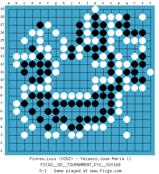 Last move : 0-1 2016 August 7 21:54:2 [Event "FICGS__GO__TOURNAMENT_KYU__000168"] [Site "FICGS"] [Date "2016.08.01"] [Round "1"] [Black "Flores,Luis"] [White "Velasco,Jose Maria"] [Result "0-1"] [Rating 1 "0262"] 1.q16 o16 2.p15 q15 3.q14 r15 4.r16 p16 5.p17 o17 6.q17 o18 7.r14 s15 8.s16 s14 9.s13 o15 10.p14 o14 11.o13 p13 12.q13 p12 13.o12 q12 14.r12 r13 15.s12 c3 16.o11 q10 17.r11 r9 18.r10 q9 19.s10 s9 20.q11 p11 21.p10 o10 22.p9 p8 23.o9 n10 24.n9 m9 25.n8 m10 26.m8 l8 27.m7 q5 28.l7 k8 29.k7 j8 30.j7 h8 31.h7 g8 32.g7 f7 33.g6 d16 34.f6 g16 35.f8 f9 36.e7 e9 37.e8 c9 38.d10 d9 39.d8 c15 40.e10 f10 41.f11 g11 42.e11 g12 43.f12 f13 44.e13 f14 45.d12 c13 46.c11 q3 47.c7 f3 48.d6 j3 49.e5 d4 50.f4 g3 51.g5 d13 52.d14 e14 53.e12 b12 54.c12 b13 55.g13 h13 56.g14 h14 57.g15 h15 58.f15 e15 59.f16 f17 60.e17 e16 61.n14 t11 62.o8 p7 63.o7 p6 64.o6 o5 65.n5 n4 66.n6 m4 67.m5 l4 68.l5 p18 69.q18 s18 70.k4 k3 71.k5 c5 72.j4 h4 73.h5 b6 74.n15 b7 75.n16 n13 76.m13 n12 77.n17 n18 78.m18 l17 79.k16 l18 80.m17 l16 81.k15 m19 82.m16 m15 83.m14 l15 84.l14 c8 85.k17 k14 86.j14 k13 87.j13 m12 0-1 Here are the names of the openings (joseki) played in the four corners : Corner q16 : q16 o16 Hoshi (Hwajeom, Seongjeom, Xingwei`) 4-4 Point. The star or hoshi (4-4) point, emphasizing influence at the potential expense of territory. Ikken Takagakari (Hankan Nop'dakeolch'im, Yi Gaojia, 1-Space High Approach). Black typically responds at 6-4 or 3-10. Black 4-10 is played when Black finds play on the right side advantageous. Black 4-8 or 3-8 may be played when Black has support at top. Player White won this Go (weiqi, baduk) game. Follow this game move after move (download)Error is one of the sources of transformation. (Pierre Audouard) At work, the authority of a person is inversely proportional to the number of pens that person is carrying. (Dan Rotaru)