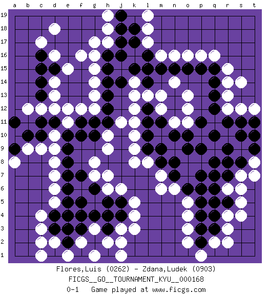 Last move : 0-1 2016 October 15 22:44:22 [Event "FICGS__GO__TOURNAMENT_KYU__000168"] [Site "FICGS"] [Date "2016.08.01"] [Round "1"] [Black "Flores,Luis"] [White "Zdana,Ludek"] [Result "0-1"] [Rating 1 "0262"] [Rating 2 "0903"] 1.d4 q16 2.q4 d16 3.q10 d10 4.p15 p16 5.q15 o16 6.o15 m16 7.n15 o3 8.m15 r12 9.q12 s14 10.r8 r15 11.r11 r13 12.q14 r14 13.e9 d9 14.e8 k4 15.h3 j3 16.h4 c3 17.d3 c4 18.j5 k5 19.j4 k3 20.h5 d5 21.e5 d6 22.e6 r3 23.q3 r4 24.p4 o4 25.p5 o5 26.o6 n6 27.p6 k8 28.l9 k9 29.l10 k10 30.n8 m7 31.n7 m6 32.m8 l8 33.m9 d13 34.j16 f16 35.k17 l18 36.k18 l17 37.l15 r6 38.q7 q2 39.p2 r2 40.p3 o2 41.r5 s5 42.q5 p1 43.r7 d2 44.e2 c2 45.f3 d8 46.e7 d7 47.e10 e11 48.f11 f12 49.g11 g12 50.h12 g13 51.h13 g14 52.l16 n16 53.q13 h17 54.h16 g16 55.j17 h18 56.j19 h19 57.j18 g17 58.h11 s6 59.q6 k11 60.l11 k12 61.l12 k14 62.k15 l13 63.j14 m13 64.h15 g15 65.h14 o13 66.p11 o11 67.o10 n11 68.n10 g8 69.m11 m12 70.o9 s7 71.s8 s4 72.s10 h9 73.f10 h7 74.f4 j6 75.g6 h2 76.g2 j2 77.f1 c17 78.l14 k13 79.p9 o12 80.f5 h10 81.f7 g7 82.g4 j11 83.e4 s12 84.d1 c1 85.h1 j1 86.r9 h6 87.g10 l19 88.q8 n14 89.p7 e1 90.c13 c12 91.c14 d14 92.c15 b12 93.d15 e15 94.d11 e12 95.c11 d12 96.c10 c9 97.b10 b9 98.a11 g1 99.a9 a8 100.c16 d18 101.t9 t7 102.t11 t12 103.s11 f2 104.e3 t8 105.t10 g3 0-1 Here are the names of the openings (joseki) played in the four corners : Corner q16 : q16 p15 Hoshi (Hwajeom, Seongjeom, Xingwei`) 4-4 Point. The star or hoshi (4-4) point, emphasizing influence at the potential expense of territory. Corner q4 : q4 o3 Hoshi (Hwajeom, Seongjeom, Xingwei`) 4-4 Point. The star or hoshi (4-4) point, emphasizing influence at the potential expense of territory. Ikken Kakari (Hankan Keolch'im, Yi Gua`jiao~, 1-Space Low Approach). White 2 is the standard approach move to the 4-4. Player White won this Go (weiqi, baduk) game. Follow this game move after move (download)Do not fear furikawari. (Anonymous) Luck never gives; it only lends. (Swedish proverb)