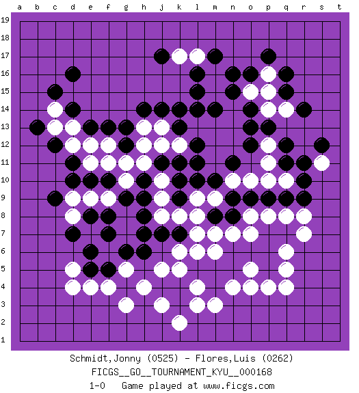 Last move : 1-0 2016 October 18 20:34:39 [Event "FICGS__GO__TOURNAMENT_KYU__000168"] [Site "FICGS"] [Date "2016.08.01"] [Round "1"] [Black "Schmidt,Jonny"] [White "Flores,Luis"] [Result "1-0"] [Rating 1 "0525"] [Rating 2 "0262"] 1.d16 d4 2.q16 q4 3.d10 q10 4.e5 e4 5.f5 f4 6.g4 g3 7.p5 q5 8.p6 q6 9.q7 r7 10.r9 r8 11.q9 q8 12.p7 p8 13.p9 o7 14.o6 o8 15.q11 p10 16.o9 p4 17.n6 n7 18.r10 p11 19.q12 o10 20.r11 p12 21.n9 n10 22.m10 m11 23.o13 m9 24.l10 l9 25.k9 k8 26.l11 m12 27.l12 m13 28.m14 l13 29.k13 k12 30.k11 j12 31.j11 j13 32.k14 n14 33.n15 m15 34.l14 o15 35.n16 m16 36.o14 n13 37.o16 p15 38.q15 p14 39.p13 p16 40.p17 q14 41.r14 m6 42.n11 o5 43.j14 h13 44.n5 o4 45.m5 m7 46.l5 l6 47.m8 l8 48.n8 n12 49.o12 k5 50.k4 k6 51.j7 j8 52.g13 h12 53.g12 h11 54.h10 j9 55.k10 g11 56.h14 g10 57.h9 j10 58.g9 f9 59.h8 g8 60.h7 g7 61.h6 g5 62.g6 h4 63.f10 f11 64.e10 e11 65.d11 f12 66.f13 e12 67.e13 d12 68.c12 d13 69.d14 c13 70.b13 c14 71.c15 l4 72.m4 l3 73.k3 m3 74.k7 l7 75.f8 n4 76.j4 j5 77.f7 j3 78.m17 l17 79.l16 k2 80.l15 k17 81.j17 d5 82.e6 e9 83.e8 d9 84.c9 d8 85.d7 s11 86.s12 1-0 Here are the names of the openings (joseki) played in the four corners : Corner d4 : d4 e5 Hoshi (Hwajeom, Seongjeom, Xingwei`) 4-4 Point. The star or hoshi (4-4) point, emphasizing influence at the potential expense of territory. Corner q4 : q4 p5 Hoshi (Hwajeom, Seongjeom, Xingwei`) 4-4 Point. The star or hoshi (4-4) point, emphasizing influence at the potential expense of territory. Corner d16 : d16 j12 Hoshi (Hwajeom, Seongjeom, Xingwei`) 4-4 Point. The star or hoshi (4-4) point, emphasizing influence at the potential expense of territory. Player Black won this Go (weiqi, baduk) game. Follow this game move after move (download)Don't defend - extend ! (Bill Taylor) For a mechanic, you seem to do an excessive amount of thinking. (C-3PO in Star Wars ep.2)