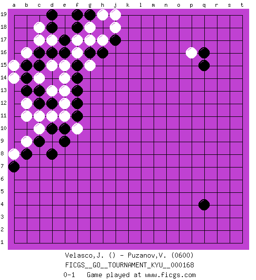 Last move : 0-1 2016 October 9 0:52:35 [Event "FICGS__GO__TOURNAMENT_KYU__000168"] [Site "FICGS"] [Date "2016.08.01"] [Round "1"] [Black "Velasco,Jose Maria"] [White "Puzanov,Vasyl"] [Result "0-1"] [Rating 2 "0600"] 1.d8 d9 2.d10 c10 3.c9 d11 4.e9 c11 5.e10 e11 6.d12 f10 7.f11 e12 8.f12 e13 9.c12 d13 10.c13 b12 11.b13 b11 12.b8 b9 13.f13 e14 14.f14 e15 15.f15 f16 16.g16 g15 17.e16 f17 18.d16 d15 19.c16 b16 20.c15 c14 21.b14 c17 22.b15 d17 23.e17 e18 24.f18 g17 25.d18 e19 26.d19 c18 27.f19 g18 28.h16 h17 29.j17 j18 30.h18 h19 31.g19 j19 32.q4 a15 33.q16 p16 34.q15 a8 35.a7 a14 0-1 Here are the names of the openings (joseki) played in the four corners : Corner d4 : d8 d9 This joseki is unknown. A weak or weird move has probably been played in this corner. Corner q16 : q16 p16 Hoshi (Hwajeom, Seongjeom, Xingwei`) 4-4 Point. The star or hoshi (4-4) point, emphasizing influence at the potential expense of territory. Player White won this Go (weiqi, baduk) game. Follow this game move after move (download)Territory is a closed space where time no longer exists. The transformation around it slower alter it, and sometimes it cracks open like a rotten egg at the least shock. (Pierre Audouard) What doesn't kill us makes us stronger. (Friedrich Nietzsche)