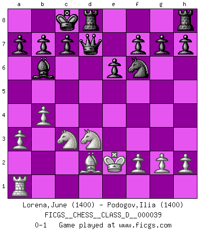 Last move : 0-1 2007 March 30 5:49:21 [Event "FICGS__CHESS__CLASS_D__000039"] [Site "FICGS"] [Date "2007.03.26"] [Round "1"] [White "Lorena,June"] [Black "Podogov,Ilia"] [Result "0-1"] [WhiteElo "1400"] [BlackElo "1400"] 1.d4 d5 2.e4 e6 3.Nc3 Bb4 4.Bd2 Nc6 5.a3 Ba5 6.Bb5 Bd7 7.b4 Bb6 8.Qe2 Nxd4 9.Bxd7+ Qxd7 10.Qd3 Nf6 11.Nf3 dxe4 12.Ne5 exd3 13.Nxd3 Nxc2+ 14.Ke2 Nxa1 15.Rxa1 O-O-O 0-1 Blackmar gambit Queenside Castling by player Black (move 15) Player Black won this chess game. Follow this game move after move (download)Chess is a beautiful mistress. (Bent Larsen) Ein bischen Romantik kann weder im Schach noch in der Liebe schaden. Also versuche ich mich ab und zu daran zu erinnern. (Nigel Short) No es una movida, aún la mejor movida que tu debas buscar, sino un plan comprensible. (Eugene Znosko-Borovsky) Mon pion favori sur ma case favorite ! Bronstein en parlant d'un coup de pion en h5 quand il avait les Noirs. The Internet isn't free. It just has an economy that makes no sense to capitalism. (Brad Shapcott)