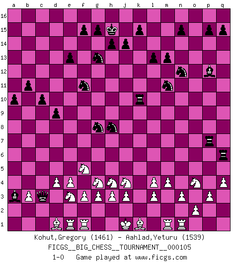 Last move : 1-0 2017 March 10 21:51:5 [Event "FICGS__BIG_CHESS__TOURNAMENT__000105"] [Site "FICGS"] [Date "2016.08.01"] [Round "1"] [White "Kohut,Gregory"] [Black "Aahlad,Yeturu"] [Result "1-0"] [WhiteElo "1461"] [BlackElo "1539"] 1.j2-k4 m15-m13 2.h1-o7 h15-g13 3.d2-d3 k16-l14 4.o7-o15 p16-o14 5.c1-p13 l14-n13 6.o15-o16 m16-o16 7.b1-c3 e15-e13 8.p1-o3 j15-l14 9.m2-m4 o14-n12 10.p13-d2 f16-b12 11.g1-j2 o16-o8 12.e2-e4 h16-o10 13.h2-g4 l16-p12 14.k1-h2 d15-d13 15.f1-e2 c16-l8 16.n2-n3 o10-b10 17.a1-b1 e16-e14 18.o1-n2 b16-c14 19.l1-m2 c14-d12 20.q1-n1 g16-f14 21.d2-e3 f14-e12 22.e1-c1 n13-m11 23.m2-l3 q16-o16 24.n1-o1 o16-o9 25.j2-g3 j16-h15 26.c3-d5 c15-c13 27.c1-e1 o9-c9 28.e3-g5 a16-o16 29.g5-c9 b10-c9 30.c2-c3 o8-p8 31.o1-p1 c9-a7 32.a2-a3 o16-o9 33.d5-e3 e14-f14 34.e1-f1 f14-f10 35.m1-o1 l14-k12 36.o3-n5 c13-c12 37.n2-m3 p8-p7 38.l3-m2 o9-j9 39.g3-f5 k12-j10 40.o1-l1 a15-a13 41.k4-j2 b12-m2 42.l1-m1 m2-f8 43.l2-l3 l8-j6 44.m3-l2 b15-b13 45.n5-m3 l15-l13 46.j2-h4 j6-l4 47.m3-o4 j9-q9 48.q2-q3 b13-b12 49.f1-e1 b12-b11 50.p2-p3 q9-q6 51.q3-q4 a13-a12 52.e1-d1 c12-c11 53.d1-f1 c11-c10 54.m1-n1 d12-f11 55.n1-m1 d13-d12 56.p1-n1 d12-d11 57.b1-e1 d11-d10 58.e1-d1 d10-d9 59.d1-e1 f10-h10 60.h2-j4 e12-f10 61.j4-h2 j10-h8 62.l2-k1 h10-k10 63.h2-j4 f10-g8 64.e2-d1 a7-b7 65.b2-b3 b7-c7 66.g2-g3 c7-c3 67.d3-d4 f8-a3 68.f2-f3 a12-a11 69.k2-k3 a11-a10 70.k3-l4 1-0 Follow this game move after move (download)Fischer is under obligation to nobody. (Joseph Platz) Im Hotelzimmer gab es nur zwei Schaben. (Über die Turnierbedingungen) (Peter Swidler) Una de estas pequeñas movidas modestas pudieran ser mas molestas a tu oponente que la amenaza mas grande. (Siegbert Tarrasch) Nous vivons dans un monde échiquéen : chaque jour qui passe est un défi à relever. (Philosophe Sasha) Wisdom begins at the end. (Daniel Webster)