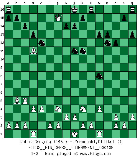 Last move : 1-0 2016 September 1 16:7:44 [Event "FICGS__BIG_CHESS__TOURNAMENT__000105"] [Site "FICGS"] [Date "2016.08.01"] [Round "1"] [White "Kohut,Gregory"] [Black "Znamenski,Dimitri"] [Result "1-0"] [WhiteElo "1461"] [BlackElo ""] 1.j2-k4 m15-m13 2.h1-o7 o15-o13 3.o7-f15 g16-f14 4.f15-o7 d15-d13 5.o7-c7 c15-c14 6.c7-l15 k16-l14 7.l15-c7 e15-e13 8.p1-o3 c16-p4 9.b1-c3 p16-o14 10.e2-e4 j15-k13 11.f1-b5 h15-j13 12.h2-g4 f16-b12 13.g1-j2 n15-n13 14.q2-q3 p4-o3 15.n2-o3 b16-d15 16.m2-m4 f14-e12 17.l1-o4 q15-q13 18.k1-h2 j13-k11 19.d2-d4 e16-f16 20.c1-k8 o14-n12 21.k8-e13 d15-e13 22.o4-e13 o16-b4 23.a1-d1 o13-o12 24.e1-e3 b4-c3 25.e3-c3 l16-p12 26.c3-c5 l14-m12 27.o1-d11 b12-k4 28.j2-k4 p12-g4 29.h2-g4 m16-l16 30.q1-n1 m12-l10 31.c7-a9 f16-f15 32.n1-n6 l10-m8 33.n6-g6 k13-j11 34.g6-g15 f15-g15 35.e13-g15 h16-g15 36.a9-g15 1-0 Follow this game move after move (download)You must take your opponent into a deep dark forest where 2+2=5, and the path leading out is only wide enough for one. (Mikhail Tal) Schach ist das schnellste Spiel der Welt, weil man in jeder Sekunde Tausende von Gedanken ordnen muß. (Albert Einstein) a manera como él juega al Ajedrez, demuestra la completa naturaleza de un hombre. (Stanley Ellin) La vie et les Echecs sont tous les deux une lutte constante. (Lasker) Looking at the proliferation of personal web pages on the Net, it looks like very soon everyone on Earth will have 15 megabytes of fame. (M.G. Sriram)