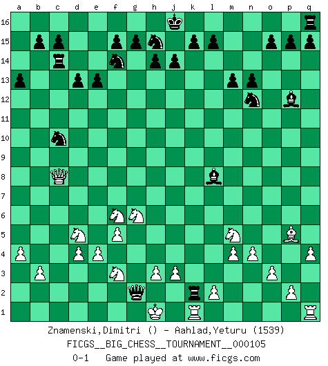 Last move : 0-1 2016 October 7 12:16:57 [Event "FICGS__BIG_CHESS__TOURNAMENT__000105"] [Site "FICGS"] [Date "2016.08.01"] [Round "1"] [White "Znamenski,Dimitri"] [Black "Aahlad,Yeturu"] [Result "0-1"] [WhiteElo ""] [BlackElo "1539"] 1.d2-d4 m15-m13 2.n2-n4 e15-e13 3.k1-l3 j15-k13 4.h2-g4 n15-n13 5.f2-f4 l16-p12 6.e2-e4 f16-b12 7.g1-f3 h16-o10 8.o2-o3 d15-d13 9.m2-m4 c16-l8 10.q2-q4 o16-f8 11.b1-c3 b16-c14 12.j2-h4 p16-o14 13.l1-m2 c14-d12 14.f4-f5 g16-f14 15.p1-q3 o14-n12 16.q3-o4 k16-l14 17.f1-b5 l14-m12 18.b5-k13 m12-k13 19.c3-d5 m16-m14 20.o1-f9 m14-k14 21.f9-k13 k14-k13 22.c2-c4 e16-e14 23.o4-m5 e14-c14 24.h4-g6 f8-e9 25.a2-a4 c14-c4 26.b2-b3 c4-c9 27.c1-g5 c9-c10 28.e1-c1 a15-a13 29.c1-c10 d12-c10 30.m2-p5 a16-a14 31.g4-f6 e9-h6 32.g5-h6 b12-h6 33.l3-k5 k13-k5 34.a1-c1 h6-c1 35.h1-c1 a14-c14 36.c1-c8 o10-g3 37.j1-h1 k5-k2 38.m1-k1 g3-g2 0-1 Follow this game move after move (download)Nonsense was the last thing Fischer was interested in, as far as Chess was concerned. (Elie Agur) Schach ist Leben. (Robert James Fischer) Debemos de asegurarnos de que el Ajedrez no se convierta en un lenguaje muerto, muy interesante, pero tan solo para un grupo muy pequeño. (Sytze Faber) Les échecs sont plus proches de l'art de l'assassinat que de l'art de la guerre. (Arturo Perez-Reverte) Watch your thoughts; they become words. Watch your words; they become actions. Watch your actions; they become habits. Watch your habits; they become character. Watch your character; it becomes your destiny. (Frank Outlaw)