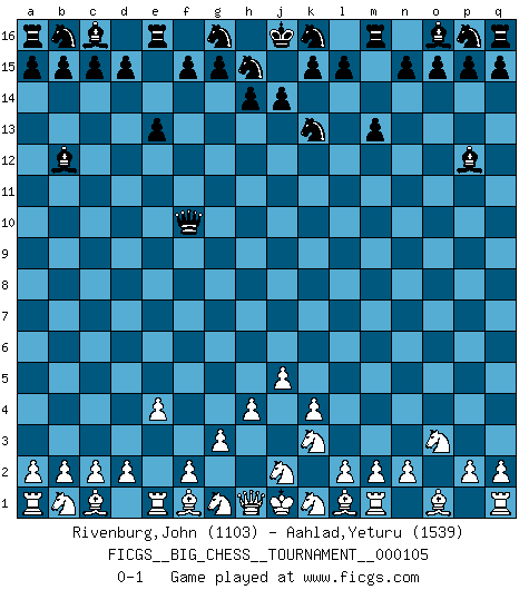 Last move : 0-1 2016 October 6 11:48:23 [Event "FICGS__BIG_CHESS__TOURNAMENT__000105"] [Site "FICGS"] [Date "2016.08.01"] [Round "1"] [White "Rivenburg,John"] [Black "Aahlad,Yeturu"] [Result "0-1"] [WhiteElo "1103"] [BlackElo "1539"] 1.h3-h4 m15-m13 2.j3-j4 e15-e13 3.e2-e4 f16-b12 4.j4-j5 l16-p12 5.k2-k4 j15-k13 6.g2-g3 h16-o10 7.h2-k3 o10-o2 8.p1-o3 o2-f10 0-1 This big chess game has been lost on time (started : 2016.08.01 12:2:49) Follow this game move after move (download)I feel as if I were a piece in a game of Chess, when my opponent says of it: That piece cannot be moved. (Soren Kierkegaard) Wenn du auf das Glück wartest, wird das Leben ziemlich langweilig. (Mikhail Nekhemyevich Tal) De eso se trata el Ajedrez. Un día le das una lección a tu oponente y al día siguiente el te da una a tí. (Bobby Fischer) Toute estimation doit être constamment réévaluée. (Jacob Estrin) Panic is a sudden desertion of us, an a going over to the enemy of our imagination. (Christian Nevell Bovee)
