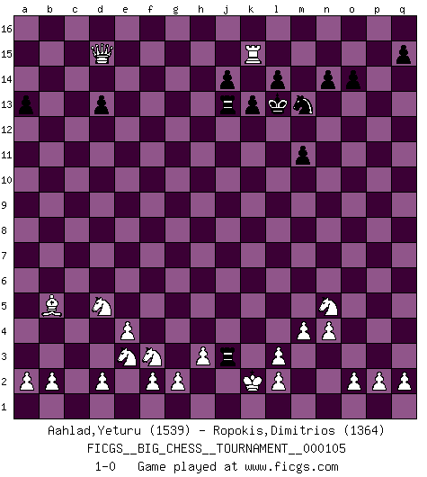Last move : 1-0 2017 January 22 0:32:1 [Event "FICGS__BIG_CHESS__TOURNAMENT__000105"] [Site "FICGS"] [Date "2016.08.01"] [Round "1"] [White "Aahlad,Yeturu"] [Black "Ropokis,Dimitrios"] [Result "1-0"] [WhiteElo "1539"] [BlackElo "1364"] 1.m2-m4 g15-g13 2.e2-e4 h16-c11 3.j2-k4 c11-c2 4.b1-c3 d15-d13 5.h2-g4 c16-l8 6.g4-e3 l8-d1 7.e3-d1 m15-m13 8.d1-e3 c2-c1 9.a1-c1 c15-c14 10.f1-b5 l15-l14 11.h1-o7 j15-h13 12.l1-o4 p16-o14 13.p1-o3 n15-n14 14.c3-d5 e15-e14 15.n2-n4 b15-b13 16.k1-l3 o16-n15 17.o1-d11 g16-f14 18.g1-f3 k15-k13 19.c1-c9 a15-a14 20.e1-c1 c14-c13 21.m1-m3 b16-c14 22.c1-c8 c14-b12 23.d11-b9 c13-c12 24.c8-b8 b12-d11 25.b9-d11 c12-d11 26.c9-c15 e14-e13 27.b8-c8 m13-m12 28.c15-f15 e16-e15 29.f15-e15 f16-e15 30.o4-e13 e15-b12 31.j1-j2 m12-m11 32.q1-c1 n15-f8 33.c8-c16 a16-c16 34.c1-c16 j16-j15 35.o7-o10 h15-k14 36.e13-f14 h13-f14 37.c16-k16 j15-k16 38.o10-k14 l16-k15 39.k14-h16 k16-l15 40.h16-f14 m16-f16 41.f14-h14 q16-h16 42.h14-g13 h16-h13 43.g13-g14 a14-a13 44.g14-d11 f16-f13 45.d11-b13 o14-m13 46.o3-n5 h13-j13 47.k4-m5 j13-j11 48.m3-o3 o15-o14 49.o3-p3 f13-j13 50.p3-p15 l15-k14 51.b13-d15 f8-l3 52.p15-k15 k14-l13 53.m5-l3 b12-l3 54.k2-l3 j11-j3 55.j2-k2 1-0 This big chess game has been lost on time (started : 2016.08.01 12:2:49) Follow this game move after move (download)You sit at the board and suddenly your heart leaps. Your hand trembles to pick up the piece and move it. But what Chess teaches you is that you must sit there calmly and think about whether it's really a good idea and whether there are other better ideas. (Stanley Kubrick) Schach ist Krieg, im Schach geht es um testosterongesteuerte Urschreie. (Garry Kasparov) ¿Cual es el objetivo de jugar una apertura de gambito?... Para adquirir una reputación de ser un jugador apuesto a costo de perder el juego. (Siegbert Tarrasch) Les Echecs ne sont pas pour les âmes timides. Ils requièrent un homme entier, qui ne s'arrête pas aveuglément à ce qui a été déjà établi, mais qui tente individuellement de sonder les profondeurs du jeu. (W. Steinitz) If you are good, you will be assigned all the work. If you are really good, you will get out of it. (Dan Rotaru)