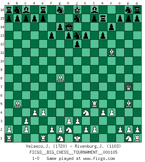 Last move : 1-0 2016 September 23 10:56:5 [Event "FICGS__BIG_CHESS__TOURNAMENT__000105"] [Site "FICGS"] [Date "2016.08.01"] [Round "1"] [White "Velasco,Jose Maria"] [Black "Rivenburg,John"] [Result "1-0"] [WhiteElo "1720"] [BlackElo "1103"] 1.j2-k4 j14-j13 2.h1-o7 g15-g14 3.m2-m4 h14-h13 4.o7-f7 f15-f14 5.d2-d4 k15-k13 6.n2-n4 m15-m14 7.c1-n11 k16-l14 8.o1-g8 n15-n14 9.l1-p5 m14-m13 10.m1-m3 f16-h14 11.e2-e4 h14-b8 12.f1-b5 o16-b4 13.b1-c3 b8-h2 14.k1-h2 b4-c3 15.b2-c3 j13-j12 16.m3-l3 m16-m14 17.n11-o12 m14-m15 18.o12-n11 f14-f13 19.l3-l14 h15-j13 20.l14-l5 h16-h14 21.f7-p7 1-0 This big chess game has been lost on time (started : 2016.08.01 12:2:49) Follow this game move after move (download)I am still a victim of Chess. It has all the beauty of art and much more. It cannot be commercialized. Chess is much purer than art in its social position. (Marcel Duchamp) Wenn ich mich einlogge, glauben die Leute gewöhnlich nicht, dass ich es selbst bin und sie fangen an, mir dumme Fragen zu stellen. Und wenn sie es glauben, stellen sie wieder andere dumme Fragen. (Judith Polgar) Si el ingenio solamente fuese necesario para lucirse, las mujeres serían las mejores jugadoras de Ajedrez del mundo. (Albin) Karpov est une pièce de musée. (Garry Kasparov) You lose, general Kenobi. (General Grievous in Star Wars ep.3)