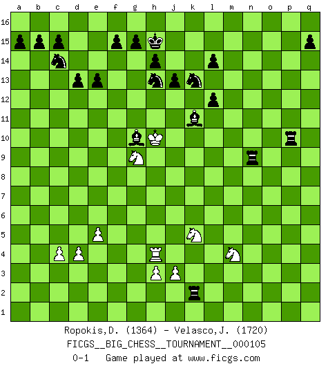 Last move : 0-1 2016 August 21 16:14:44 [Event "FICGS__BIG_CHESS__TOURNAMENT__000105"] [Site "FICGS"] [Date "2016.08.01"] [Round "1"] [White "Ropokis,Dimitrios"] [Black "Velasco,Jose Maria"] [Result "0-1"] [WhiteElo "1364"] [BlackElo "1720"] 1.j2-k4 j15-k13 2.m2-m4 h16-o10 3.n2-n4 o10-f2 4.g1-f3 n15-n13 5.d2-d4 f2-g3 6.c1-g5 g3-b8 7.b1-d2 o16-d6 8.e2-e4 d6-g3 9.e1-e3 b8-b2 10.a1-b1 b2-a2 11.e3-b3 m15-m13 12.f1-d3 a2-a9 13.e4-e5 g3-j5 14.k4-l6 j5-c11 15.b3-b9 a9-a10 16.b1-b8 e15-e13 17.h1-b1 b16-c14 18.o1-h7 a10-p10 19.l6-k8 p10-p2 20.p1-n2 p2-n4 21.n2-p3 n4-l2 22.m1-m2 c11-m2 23.l1-m2 f16-c13 24.q1-l1 l2-q7 25.k8-m9 c13-m4 26.k1-l3 m4-o2 27.l3-n4 o2-b14 28.h7-m11 q7-d7 29.d3-b5 d7-d11 30.m11-k13 j14-k13 31.b5-k13 l15-l14 32.b9-b11 d11-m3 33.k13-h15 j16-h15 34.c2-c4 m3-m9 35.m2-h6 d15-d13 36.b1-j8 g16-f14 37.b11-j11 k16-j14 38.j8-p8 p16-n15 39.b8-j8 c16-g12 40.l1-l9 m9-p12 41.l9-p9 p12-l12 42.p8-o7 g12-h13 43.o7-o15 n15-o13 44.p9-l9 q16-o16 45.o15-o16 m16-o16 46.l9-l12 m13-l12 47.g5-e7 o16-m16 48.d2-e4 h13-l10 49.j8-j4 m16-m1 50.j1-j2 l10-o7 51.h2-k3 o13-m12 52.n4-l3 m1-m2 53.p3-n4 m2-q2 54.n4-m6 o7-k11 55.k3-m4 l16-o13 56.h6-g7 q2-q4 57.l3-k5 e16-m16 58.e7-d8 m16-m13 59.d8-k14 f14-h13 60.j11-j14 k15-j14 61.k14-h12 q4-p4 62.e4-d6 m12-k13 63.h12-b6 b14-m4 64.k5-m4 m13-m6 65.b6-f10 j14-j13 66.g7-n13 a16-n16 67.n13-p15 p4-p15 68.f3-h4 n16-n4 69.h4-k5 m6-m10 70.j4-h4 m10-f10 71.d6-e8 f10-m10 72.e8-g9 m10-g10 73.g9-h11 g10-g2 74.j2-k3 o13-g6 75.k3-l3 p15-p3 76.l3-l4 g2-k2 77.l4-m5 g6-j8 78.m5-m6 p3-p6 79.m6-l7 n4-n7 80.l7-k8 p6-p8 81.k8-j9 j8-g10 82.h11-g9 n7-n9 83.j9-h10 p8-p10 0-1 Follow this game move after move (download)If you aren't afraid of Spassky, then I have removed the element of money. (Jim Slater) Wie gewinnt Tal? Er entwickelt alle seine Figuren in die Brettmitte und opfert sie dann irgendwo. (Robert James Fischer) La táctica fluye a partir de una posición superior. (Bobby Fischer) Avec des compensations pour le matériel en plus... (Anonyme) Players are not good because they find tactics, it is about the way to find the positions in which those tactics are hidden. (Luc-Olivier Leclerc)