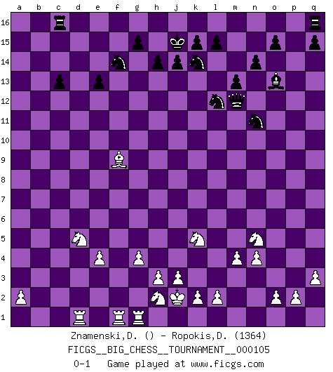 Last move : 0-1 2016 August 8 17:7:11 [Event "FICGS__BIG_CHESS__TOURNAMENT__000105"] [Site "FICGS"] [Date "2016.08.01"] [Round "1"] [White "Znamenski,Dimitri"] [Black "Ropokis,Dimitrios"] [Result "0-1"] [WhiteElo ""] [BlackElo "1364"] 1.e2-e4 e15-e13 2.d2-d4 d15-d13 3.n2-n4 m15-m13 4.c2-c4 c15-c13 5.q2-q3 h15-g13 6.b1-c3 c16-k9 7.c1-l9 g13-h11 8.m2-m4 f16-e15 9.l9-e15 e16-e15 10.j2-h4 l16-o13 11.f1-d3 j15-k13 12.h2-j4 h16-m12 13.g1-f3 b16-c14 14.k1-l3 n15-n14 15.h1-k3 o16-g9 16.f3-e5 g9-d6 17.f2-f4 p16-o14 18.g2-g4 e15-e14 19.p1-o3 e14-f14 20.c4-c5 d6-m14 21.k3-k9 h11-f10 22.k9-d15 c14-e15 23.d15-b15 a16-c16 24.b15-a15 f10-g8 25.l1-p5 f14-f4 26.p5-e15 k16-h15 27.e15-l9 f4-f9 28.l9-j7 g8-j7 29.o1-f9 m14-c5 30.h4-g6 j7-g6 31.e5-g6 c5-d4 32.g6-e7 m12-e5 33.j1-j2 e5-e7 34.a15-f15 k13-j11 35.f15-d13 g16-f14 36.d13-d4 j16-j15 37.l3-k5 m16-d16 38.d4-l11 d16-d3 39.a1-d1 d3-f3 40.e1-f1 e7-f8 41.f1-f3 f8-f3 42.m1-f1 f3-g2 43.j4-h2 j11-l12 44.o3-n5 o14-p12 45.l11-p15 p12-n11 46.p15-m12 h15-k14 47.q1-g1 g2-b2 48.c3-d5 b2-m12 0-1 Follow this game move after move (download)Weak points or holes in the opponent's position must be occupied by pieces not Pawns. (Siegbert Tarrasch) Schach wird sich dank seiner hohen kulturellen Tradition immer durchsetzen. In näherer Zukunft womöglich sogar als Gegenreaktion auf die maßlose Reizüberflutung im Freizeit- und Spielbereich. (Garry Kasparov) Tu puedes aprender mucho mas de una partida que pierdas que de una partida ganada. Tendras que perder cientos de partidas antes de llegar a ser un buen jugador. (Jose Raul Capablanca) On peut tirer plus d'utilité d'une partie perdue que de 100 parties gagnées. (Capablanca) Don't anthropomorphize computers - they hate it. (Anonymous)