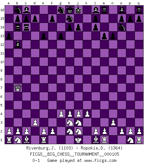 Last move : 0-1 2016 September 23 22:57:35 [Event "FICGS__BIG_CHESS__TOURNAMENT__000105"] [Site "FICGS"] [Date "2016.08.01"] [Round "1"] [White "Rivenburg,John"] [Black "Ropokis,Dimitrios"] [Result "0-1"] [WhiteElo "1103"] [BlackElo "1364"] 1.h3-h4 e15-e13 2.g1-h3 g15-g13 3.j3-j4 k16-l14 4.k1-j3 e16-e14 5.g2-g4 f16-b12 6.k2-k4 p16-o14 7.h1-b7 a15-a13 8.n2-n3 a16-a14 9.f1-g2 n15-n13 10.g2-c6 a14-b14 11.d2-d3 e14-c14 12.c6-l14 j15-l14 13.o1-f9 m15-m13 14.f9-l14 k15-l14 0-1 This big chess game has been lost on time (started : 2016.08.01 12:2:49) Follow this game move after move (download)In the perfect Chess combination as in a first-rate short story, the whole plot and counter-plot should lead up to a striking finale, the interest not being allayed until the very last moment. (Yates and Winter) Ich bewundere Kasparows phantasievolle Angriffssiege aus den Achtzigern und Neunzigern, aber wenn man sie mit dem Computer überprüft, nimmt der Computer in jeder zweiten Partie die Opfer an, verteidigt sich und gewinnt. (Vladimir Kramnik) El Ajedrez es un terrible juego. Si no controlas el centro, tu oponente tiene una posición mas holgada. Si tienes control del centro, ¡entonces realmente tu tienes algo de que preocuparte!. (Siegbert Tarrasch) Il a essayé de se convaincre qu'il pourrait empêcher toutes les erreurs et ne jamais perdre. L'horreur ! Gary Kasparov au sujet de Robert Fischer. There is far too much law for those who can afford it and far too little for those who cannot. (Derek Bok)