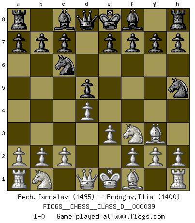 Last move : 1-0 2007 May 27 17:16:17 [Event "FICGS__CHESS__CLASS_D__000039"] [Site "FICGS"] [Date "2007.03.26"] [Round "1"] [White "Pech,Jaroslav"] [Black "Podogov,Ilia"] [Result "1-0"] [WhiteElo "1495"] [BlackElo "1400"] 1.d4 d5 2.Nf3 Nc6 3.Bf4 Nf6 4.e3 Nh5 5.Bg3 1-0 This chess game has been lost on time (started : 2007.03.26 19:3:8) Queen's pawn game, Chigorin variation Player White won this chess game. Follow this game move after move (download)One doesn't have to play well, it's enough to play better than your opponent. (Siegbert Tarrasch) Ein Gewinn durch eine ungenaue Kombination, sei sie auch noch so vorzeigbar, erfüllt mich mit Schaudern. (Wilhelm Steinitz) Hasta este punto, las blancas han seguido un análisis bien conocido. Pero ahora el hace un error fatal: empieza a usar su propia cabeza. (Siegbert Tarrasch) Le thème de l'attaque double intervient d'une manière ou d'une autre dans l'immense majorité des combinaisons. (Youri Averbakh) When you stop learning you start dying. (M. Scott Adams)