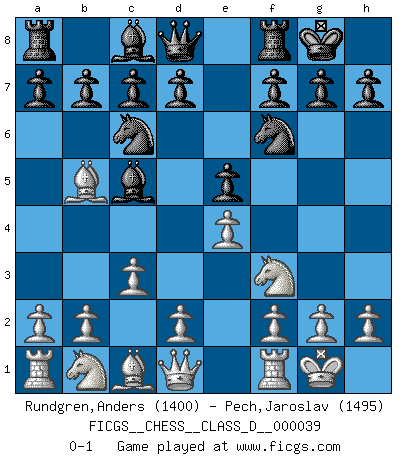 Last move : 0-1 2007 May 23 16:43:52 [Event "FICGS__CHESS__CLASS_D__000039"] [Site "FICGS"] [Date "2007.03.26"] [Round "1"] [White "Rundgren,Anders"] [Black "Pech,Jaroslav"] [Result "0-1"] [WhiteElo "1400"] [BlackElo "1495"] 1.e4 e5 2.Nf3 Nc6 3.Bb5 Bc5 4.c3 Nf6 5.O-O O-O 0-1 This chess game has been lost on time (started : 2007.03.26 19:3:8) Ruy Lopez : Classical defense, 4.c3 Kingside Castling by player White (move 5) Kingside Castling by player Black (move 5) Player Black won this chess game. Follow this game move after move (download)In blitz, the Knight is stronger than the Bishop. (Vlastimil Hort) Ich spiele ehrlich und spiele, um zu gewinnen. Wenn ich verliere nehme ich meine Medizin. (Robert James Fischer) El Ajedrez detiene a su maestro dentro de sus propios vínculos, encadenando la mente y el cerebro, por lo que la libertad interior del mas fuerte debe sufrir. (Albert Einstein) Le moment que je préfère le plus dans une rencontre, c'est celui où je sens que la personnalité de l'adversaire se brise. (Robert Fischer) Whoever said the pen is mightier than the sword obviously never encountered automatic weapons. (US General Douglas MacArthur)