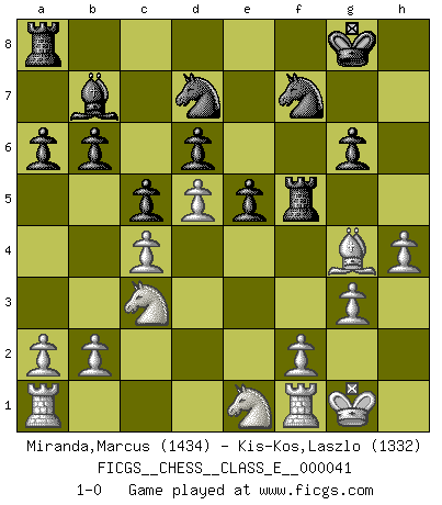Last move : 1-0 2007 May 1 7:26:18 [Event "FICGS__CHESS__CLASS_E__000041"] [Site "FICGS"] [Date "2007.03.26"] [Round "1"] [White "Miranda,Marcus"] [Black "Kis-Kos,Laszlo"] [Result "1-0"] [WhiteElo "1434"] [BlackElo "1332"] 1.d4 Nf6 2.c4 c5 3.d5 d6 4.Nc3 g6 5.Nf3 Bg7 6.e4 O-O 7.Be2 a6 8.O-O e6 9.Bf4 e5 10.Bg5 b6 11.Ne1 h6 12.Be3 Nbd7 13.h3 Nh7 14.Qd2 f5 15.exf5 Rxf5 16.Bxh6 Bxh6 17.Qxh6 Qg5 18.Qxg5 Nxg5 19.h4 Nf7 20.g3 Bb7 21.Bg4 1-0 Benoni defense, Hromodka system Kingside Castling by player Black (move 6) Kingside Castling by player White (move 8) Player White won this chess game. Follow this game move after move (download)Kasparov : J'adoube , Ivanchuk : S'il vous plaît ! (Garry Kasparov & Vassily Ivanchuk, Linares 1997) Wenn ich einen Club besuche, sind die Spieler stumm vor Staunen. (José Raúl Capablanca) Nos gusta pensar. (Gary Kasparov) Les échecs c'est le défi de l'alpiniste, toujours plus haut, prêt à tout pour monter à l'assaut du Roi ennemi. Les échecs, c'est de la musique en mouvement, un ballet majestueux pour les yeux. C'est de la poésie composée par les fantômes du passé qui au même titre que Rimbaud ou Verlaine méritent notre admiration. Les échecs, c'est de la peinture ou le moindre mouvement modifie le tableau pour en faire un Picasso ou un Van Gogh. Les échecs, c'est tout et rien, c'est la vie et la mort. Jjulie33 sur le forum de France-Echecs. To err is human, but to really foul things up requires a computer. (Farmer's Almanac, 1978)