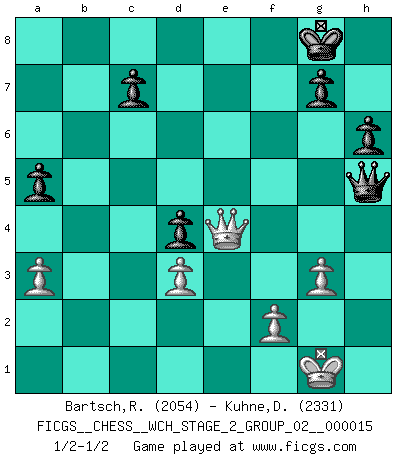 Last move : 1/2-1/2 2016 October 11 16:15:6 [Event "FICGS__CHESS__WCH_STAGE_2_GROUP_02__000015"] [Site "FICGS"] [Date "2016.08.04"] [Round "1"] [White "Bartsch,Reinhard Andrea"] [Black "Kuhne,Detlev"] [Result "1/2-1/2"] [WhiteElo "2054"] [BlackElo "2331"] 1.c4 e5 2.Nc3 Nf6 3.Nf3 Nc6 4.g3 d5 5.cxd5 Nxd5 6.Bg2 Nb6 7.d3 Be7 8.O-O O-O 9.a3 Be6 10.Be3 f5 11.Rc1 a6 12.b4 Kh8 13.Bc5 Bxc5 14.bxc5 Nd5 15.Qb3 Nxc3 16.Qxc3 Qf6 17.Rb1 Rab8 18.Ne1 Nd4 19.Qb2 f4 20.e3 f3 21.exd4 fxg2 22.Nxg2 exd4 23.Nf4 Bf7 24.h4 h6 25.Rfe1 b6 26.h5 Kh7 27.cxb6 Rxb6 28.Qe2 Re8 29.Qd1 Rxb1 30.Qxb1 Re5 31.Rxe5 Qxe5 32.Qb7 a5 33.Qa8 Bxh5 34.Nxh5 Qxh5 35.Qe4+ Kg8 1/2-1/2 English Opening Kingside Castling by player White (move 8) Kingside Castling by player Black (move 8) This chess game ended in a draw. Follow this game move after move (download)It is no time to be playing Chess when the house is on fire. (Italian Proverb) Die Partien sind immer verschieden, die Interviews immer die gleichen. (Garry Kasparov) Debes de llevar a tu oponente hacia un profundo y obscuro bosque donde 2+2=5, y el camino que conduce a la salida es suficientemente ancho para solamente uno. (Mikhail Tal) Le génie consiste à savoir transgresser les règles au moment opportun. (Teichmann) Waiting for chance ? Play in casinos. (FICGS proverb)